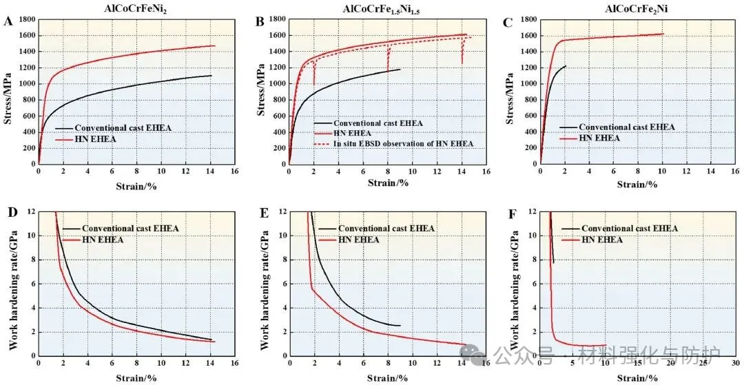 该多尺度异质纳米共晶高熵合金在保持高强度水平的同时,仍然能够保持可观的塑性变形能力,这一强塑组合相较于目前已报道的常规共晶合金及高熵合金体系要更为优异,这说明团队设计的异质结构能够有效缓解应变集中,延缓颈缩与失稳的发生。