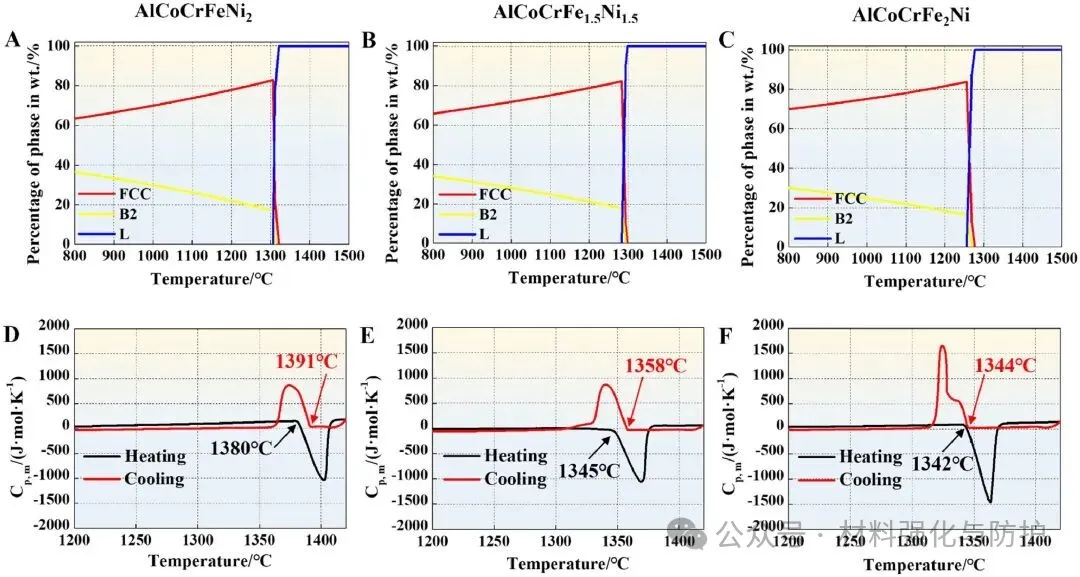 三种铸态AlCoCrFexNiy合金的平衡相图和DSC曲线