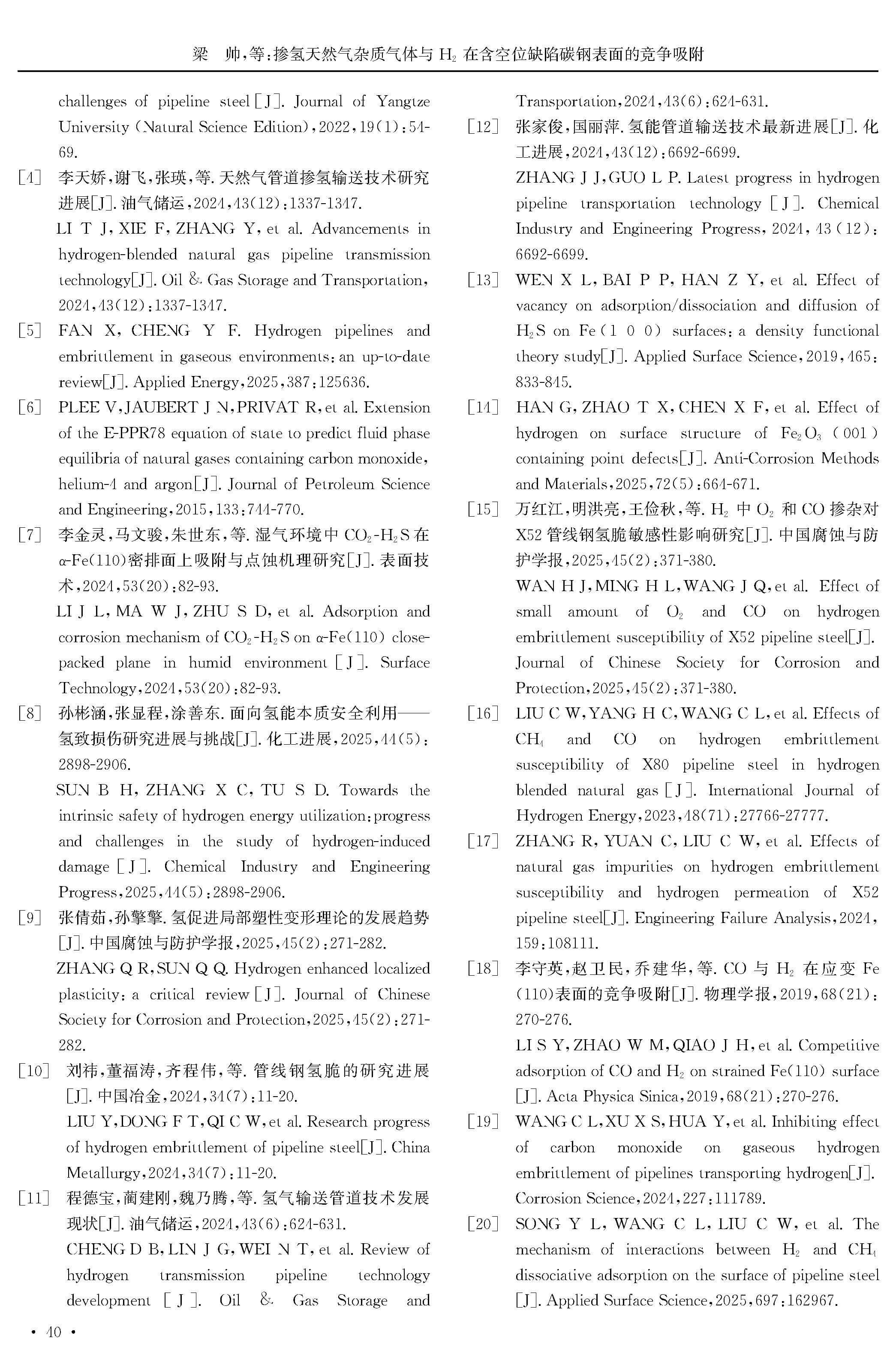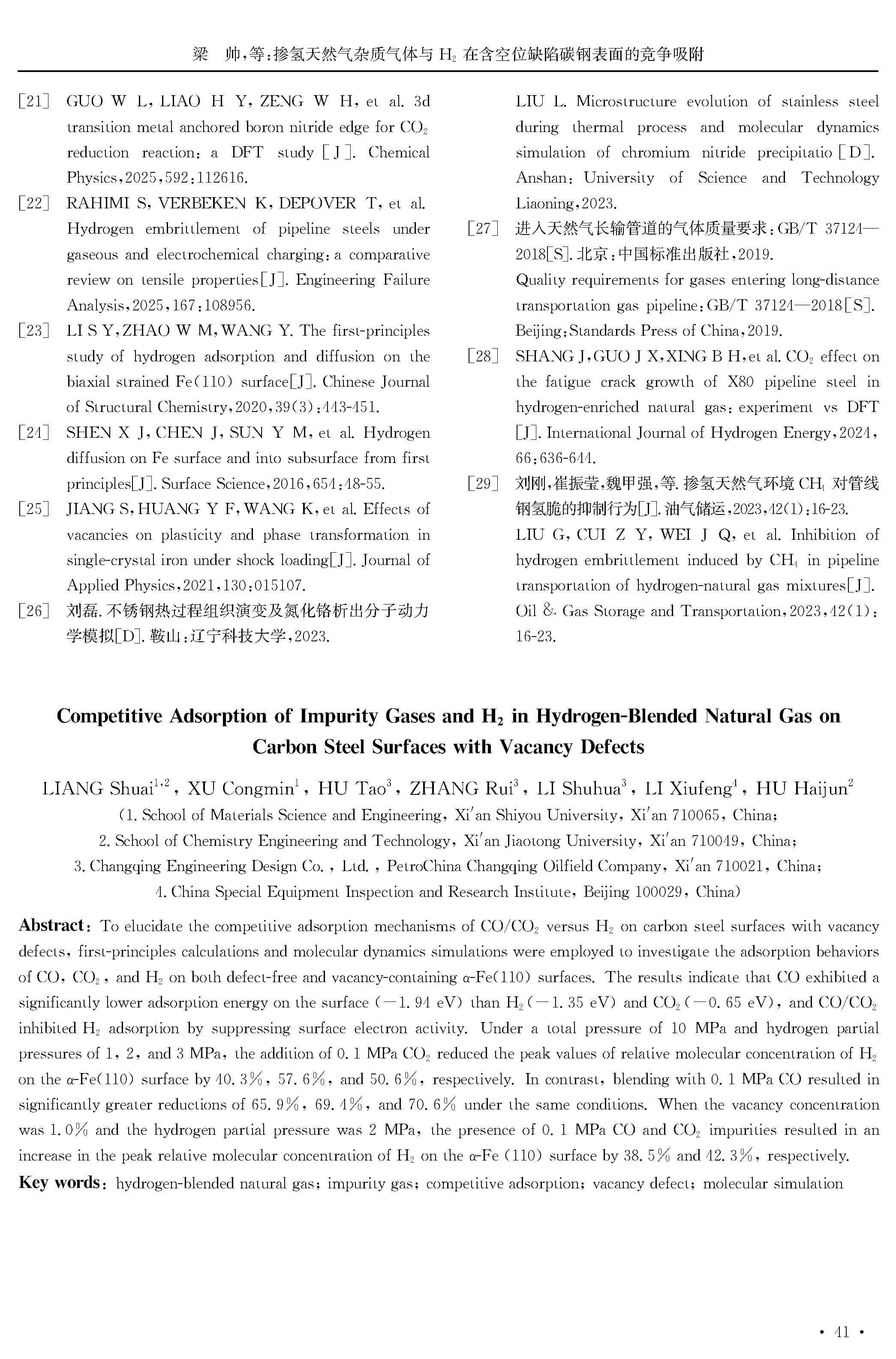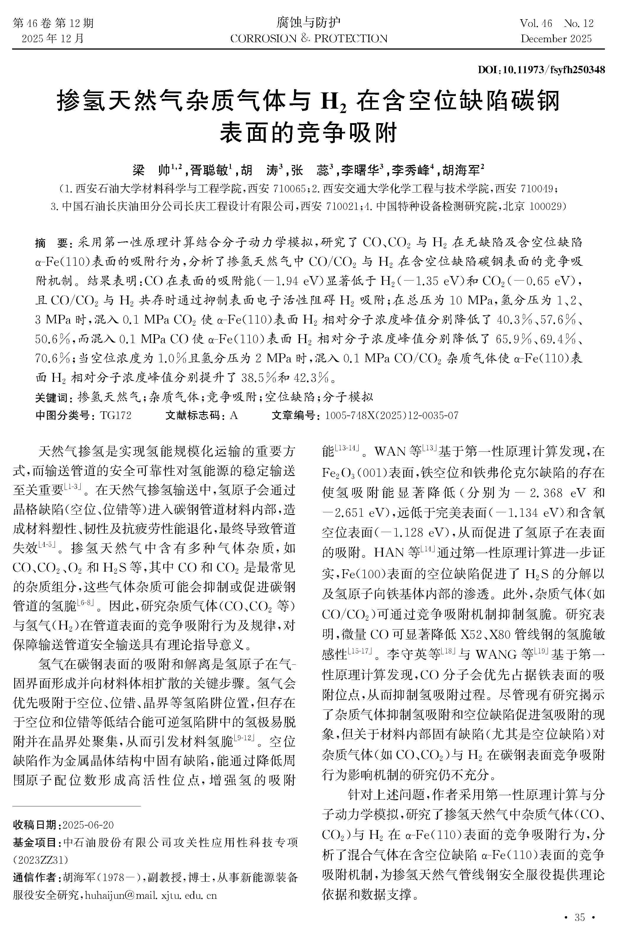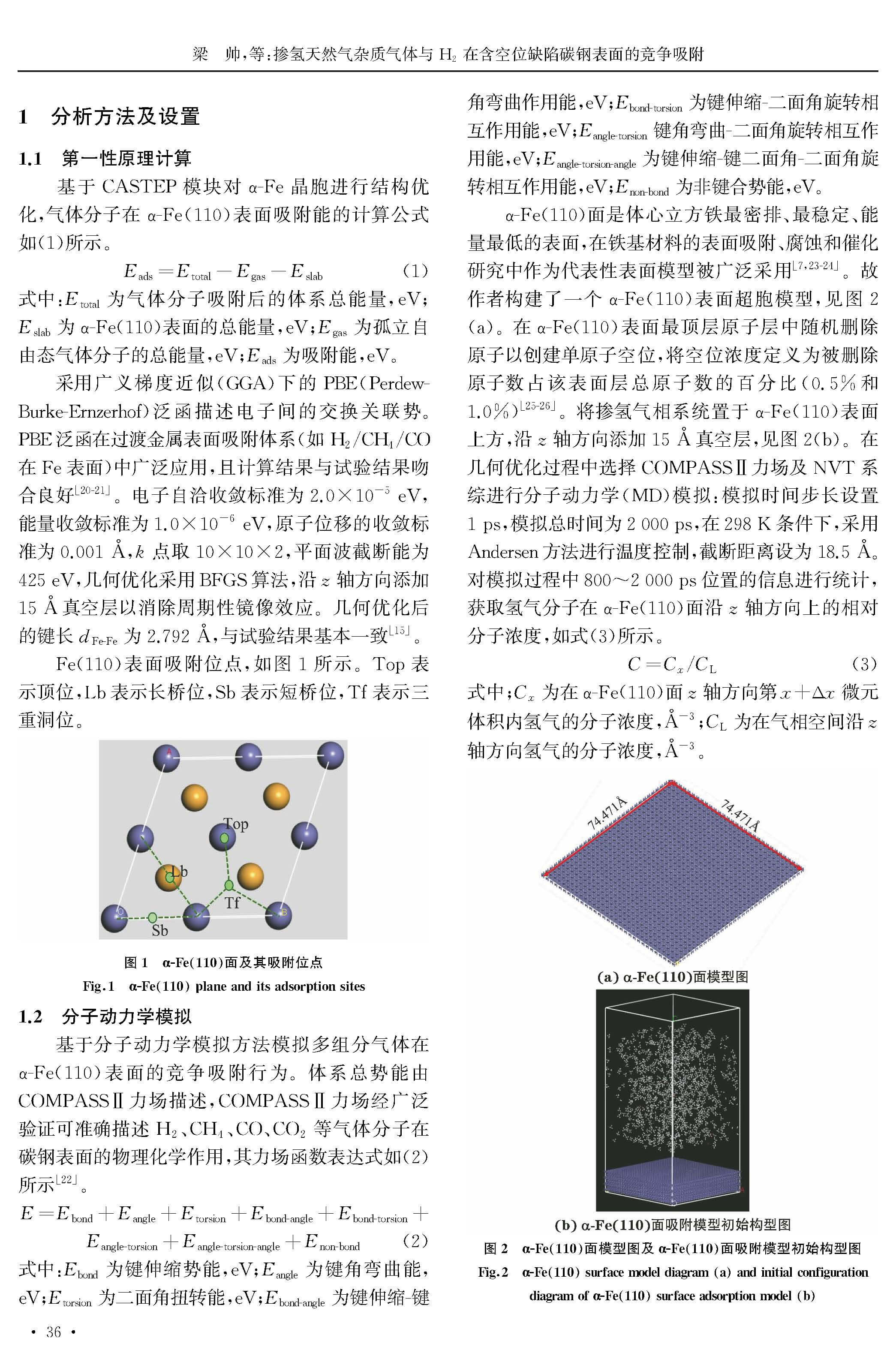 掺氢天然气杂质气体与 H2 在含空位缺陷碳钢表面的竞争吸附