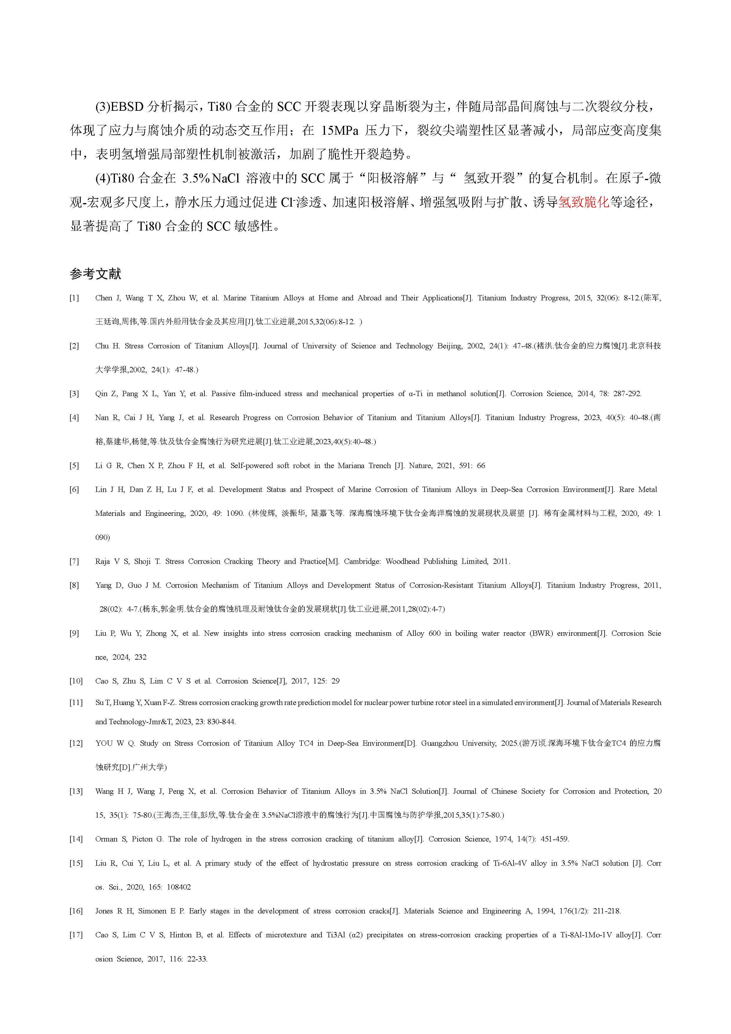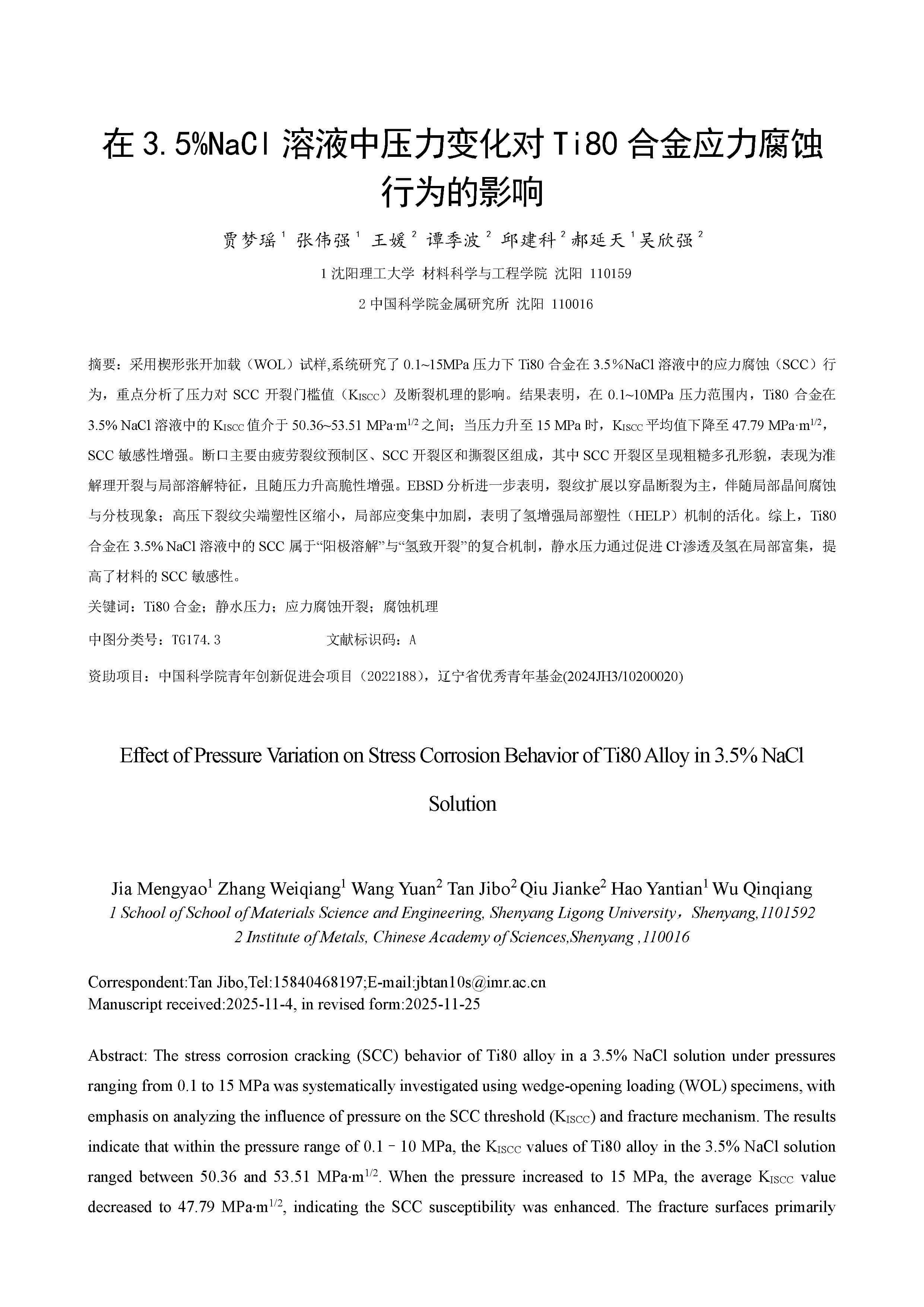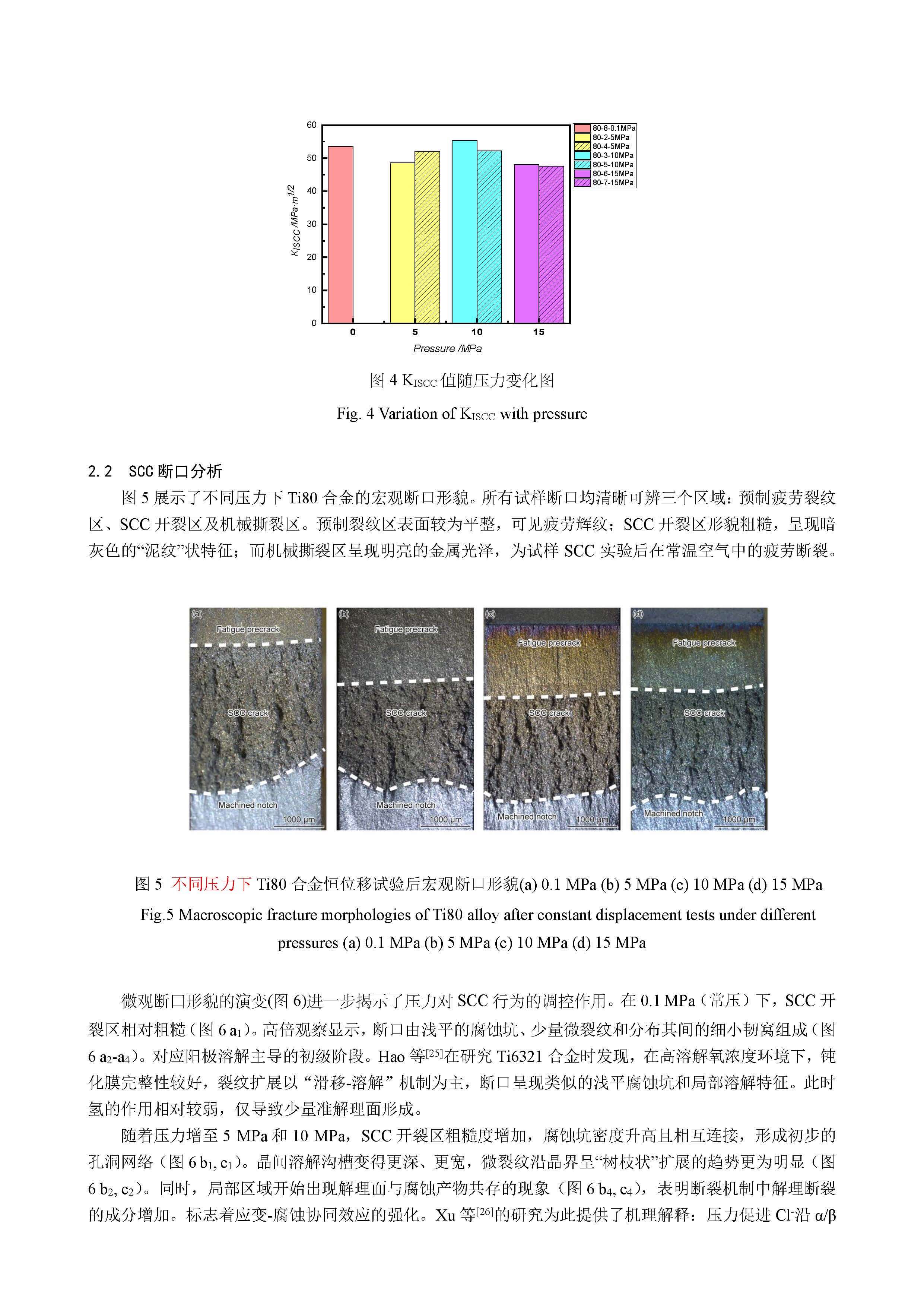 在 3.5%NaCl 溶液中压力变化对 Ti80 合金应力腐蚀行为的影响
