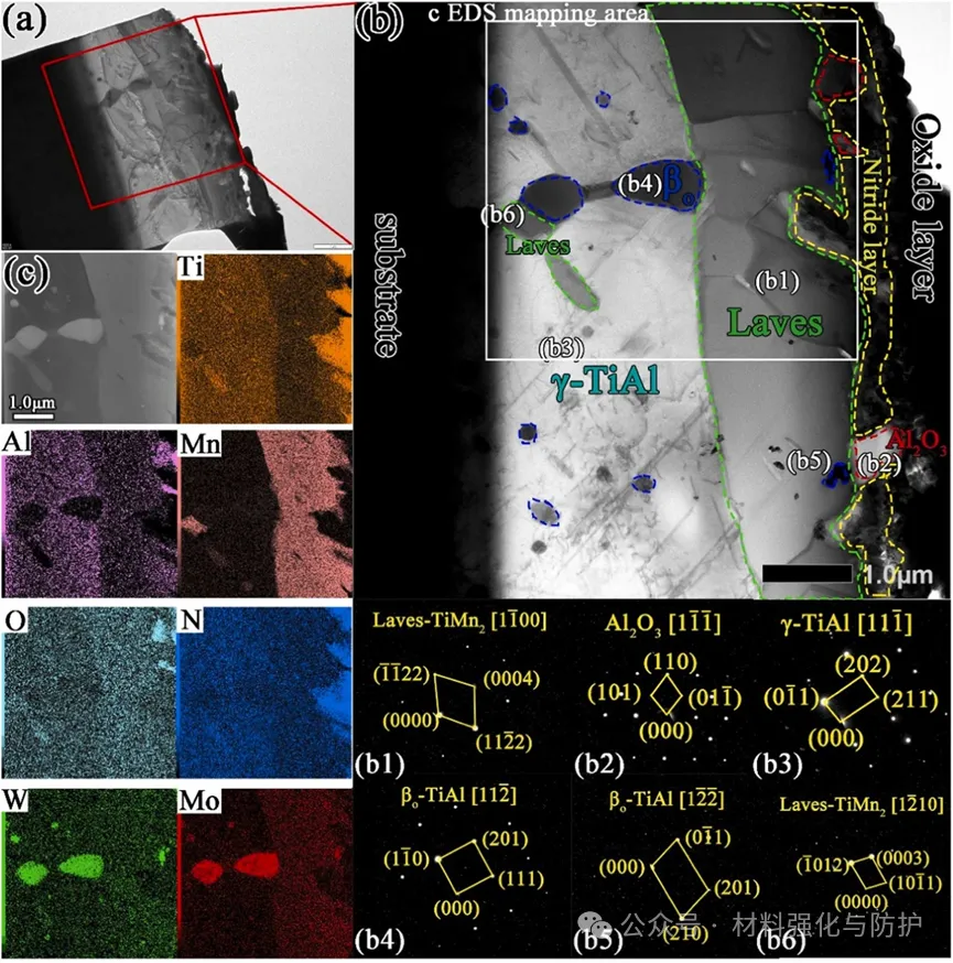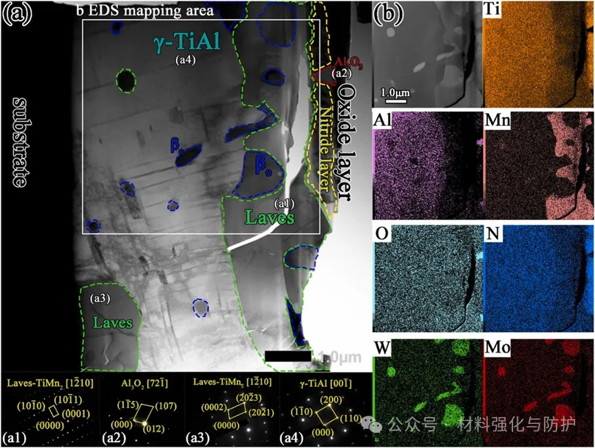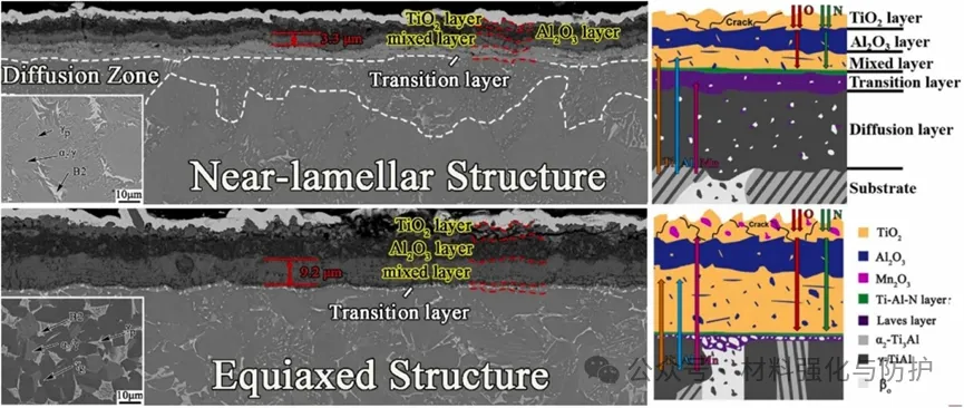 NL结构在长期氧化中会发生α₂+γ→γ+β₀+Laves相变,扩散区持续供给Mn并维持Laves相连续性,以抑制Mn外扩散和O的内扩散。EQ结构中β₀相会破坏过渡层完整性,Mn易外扩散形成疏松α-Mn₂O₃,从而加速氧化层增厚。
