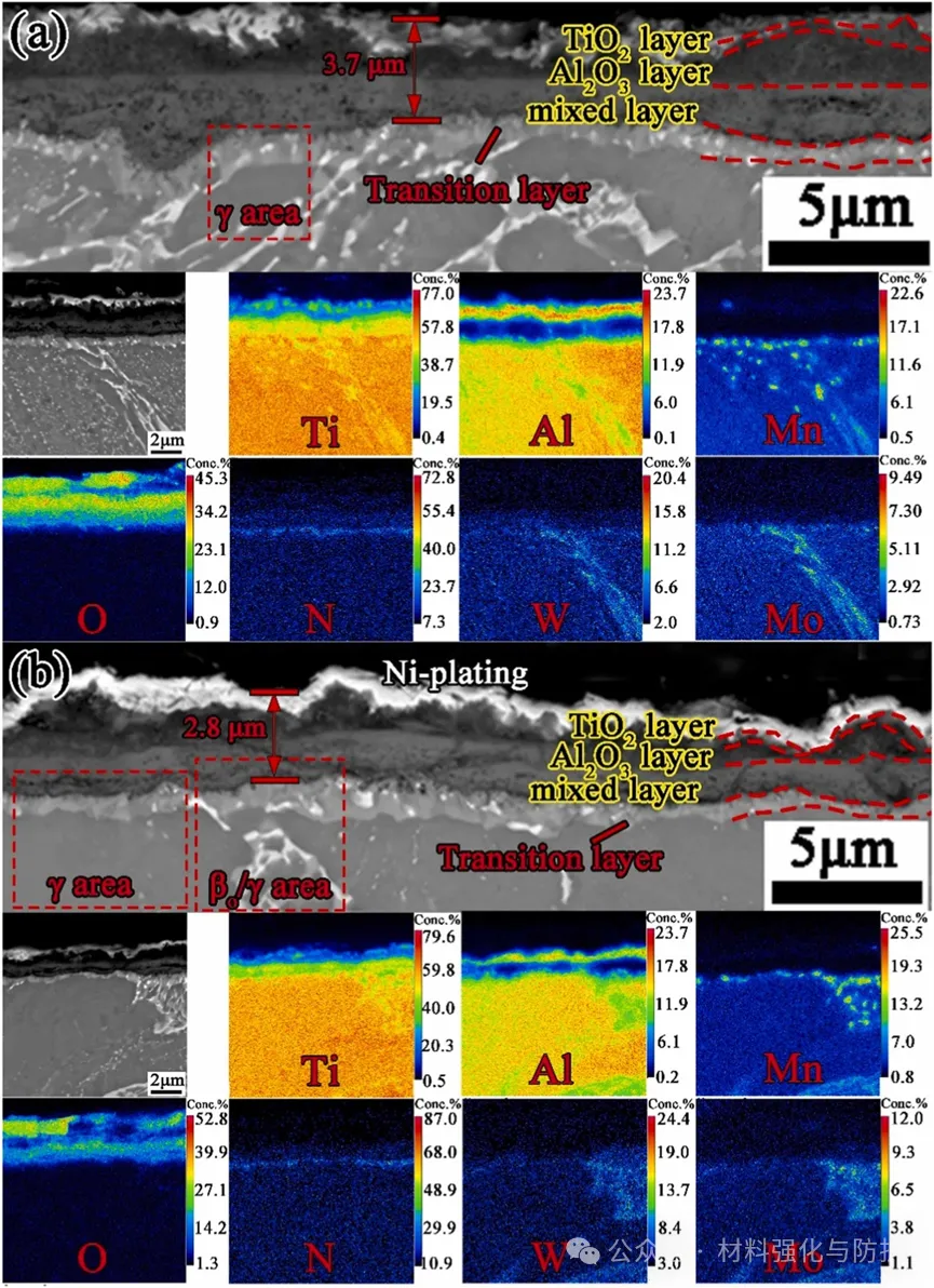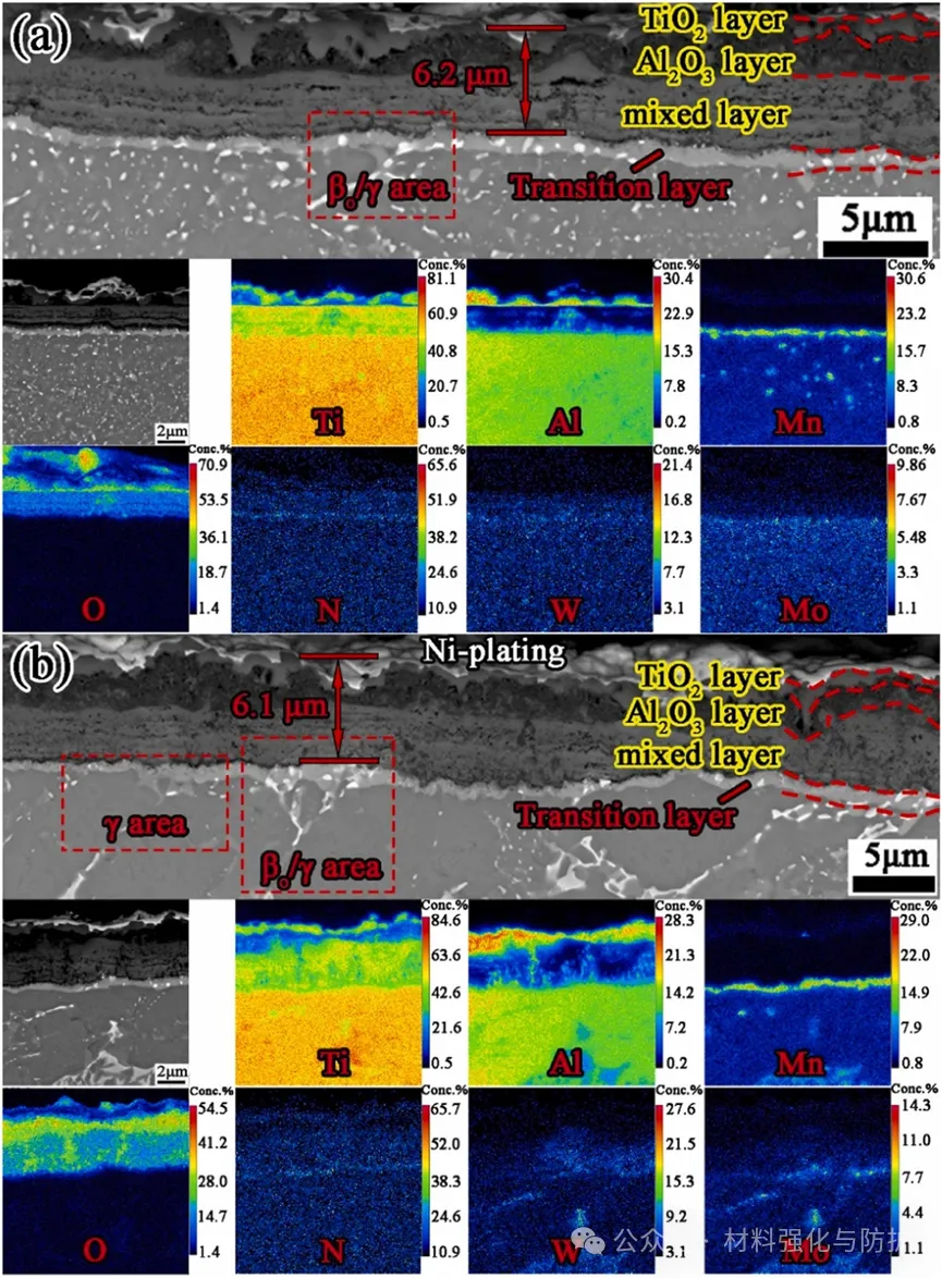 TMMW合金在750°C、3000小时等温氧化后,具有(a)NL结构和(b)EQ结构的TMMW合金横截面形态EPMA-BSE图像