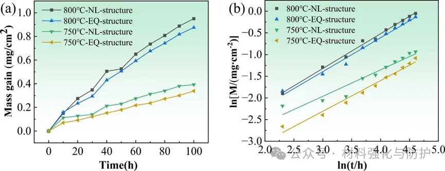 在750/800℃-100h的短期循环氧化下,等轴(EQ)结构氧化抗性略优于近层片(NL)结构,两者均可以形成完整的无开裂氧化层,750℃时EQ和NL质量分别为0.339 mg·cm⁻²和0.393 mg·cm⁻²。在750℃,≥500h的长期等温氧化条件下,NL结构氧化抗性显著更优,3000h时氧化层厚度仅为8.7μm,而EQ的为17.4μm,且氧化层增长速率远低于EQ结构。