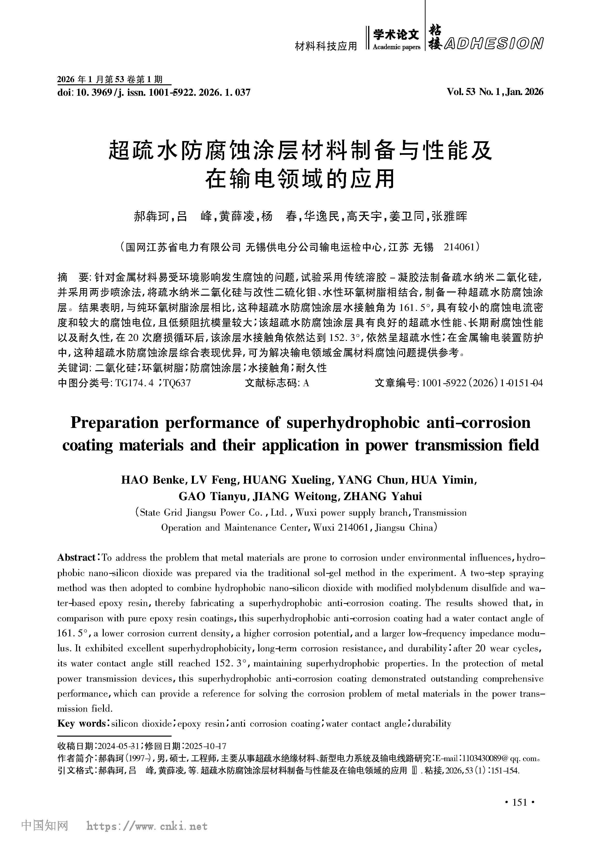 超疏水防腐蚀涂层材料制备与性能及在输电领域的应用