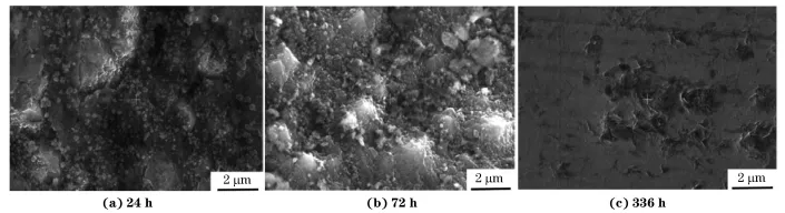 采用循环水化学试验系统对SiC/SiCf复合材料包壳管进行耐水侧腐蚀性能测试。试验条件模拟压水堆一回路水化学环境,溶液为含1200mg/LH3BO3和2mg/LLiOH的高纯去离子水溶液,溶解氧质量浓度为5μg/L,试验温度为(360±1) ℃,压力 为(20±0.5) MPa。 试样为SiC/SiCf复合材料包壳管(外径10mm、 内径8mm、长20mm) 。SiC/SiCf复合材料包壳管整体为三层结构:内层为致密的CVD-SiC层,中间层为SiC纤维编织层,外层为CVD-SiC涂层。其中,SiC纤维编织层(中间层) 采用化学气相渗透法(CVI)制备,填补了SiC/SiCf复合材料间的空隙。 使用金刚石金相砂纸和抛光液对试样截面进行打磨和抛光,随后用自来水冲洗试样5min,去除表面磨抛残留物后,再用去离子水冲洗5min,待试样干燥后放入乙醇中超声清洗 20min并烘干。腐蚀试验前,使用游标卡尺及千分尺测量试样尺寸并计算表面积,采用精度为0.01mg的电子分析天平称量,计算试样腐蚀前后的质量损失及腐蚀速率。 SiC/SiCf复合材料包壳管腐蚀试验的总时长为164天。试样腐蚀不同时间(0,24,72,336,1008,1680,2400,3120,3936h)后取出,并进行观察、表征和称量。采用扫描电子显微镜(SEM)对试样的表面及截面形貌进行观察,采用能量色散谱仪(EDS)对其成分进行分析,根据式(1)计算试样的腐蚀速率。 式中:v为试样的腐蚀速率,mg/(cm2·h);m前为试验前试样的质量,mg;m后试验后试样总质量,mg; S为试样的表面积,cm2 ;t为试验时间,h。