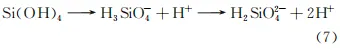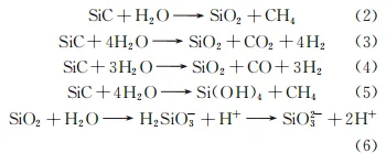 2. 1 原始试样腐蚀形貌 由图1可见:原始SiC/SiCf复合材料包壳管试样外涂层为CVD-SiC,表面平整且孔隙缺陷少。在局部区域可观察到由抛光引起的划痕缺陷,外涂层没有明显的因沉积而出现的凹凸起伏,表明采用CVD制备工艺,外涂层较好地填补了SiC纤维的表面凹凸,试样表面结构平整,这有利于提高包壳管的抗腐蚀能力。 图1 未腐蚀试样的表面SEM 形貌 由图2可见:原始SiC/SiCf复合材料包壳管试样外壁为致密的CVD-SiC层,晶体质量好,无明显缺陷,厚度约为65μm,CVD-SiC层保护包壳管基体不受外侧水环境的腐蚀。中间基体层由SiC纤维编织而成,SiC纤维编织结构采用CVI方法填充SiC,减少了孔隙率,提高了包壳管的气密性以及导热能力。 图2 未腐蚀试样的截面SEM形貌 2.2 腐蚀速率 根据图3所示腐蚀质量损失曲线,将腐蚀过程分为三个阶段:腐蚀质量增加阶段(0~ 336小时,腐蚀初期) ;腐蚀质量增加-减少过渡阶段(336~1008小时,腐蚀中期);腐蚀质量减少阶段(1008~3936小时,腐蚀后期)。当腐蚀时间超过1008小时,试样在水溶液中整体表现为腐蚀质量减少。 图3 经过不同时间腐蚀后试样的质量损失曲线及腐蚀速率曲线 当腐蚀时间为0~336小时时,试样质量增加0.643mg/cm2[腐蚀速率为0.0019mg/(cm2 ·h)],表明试样表面发生氧化/钝化反应。 当腐蚀时间为336~1008小时时,试样的质量变化由质量增加转为质量减少,且当试验时间为1008h时,试样的质量损失为0.585mg/cm2[腐蚀速率为0.00058mg/(cm2·h)] 当腐蚀时间为1008~3936h时,试样质量持续减少,且随着试验时间的延长,,试样的腐蚀速率变化不明显,说明SiC/SiCf复合材料包壳管的腐蚀溶解处于一个相对稳定的阶段。经过3936小时腐蚀后,试样的腐蚀质量损失为2.982mg/cm2[腐蚀速率约为0.00076mg/(cm2·h)],表明材料进入均匀腐蚀阶段。 SiC/SiCf复合材料包壳管为两端开口,其内外侧均有腐蚀。根据SiC的密度(3.21g/cm3)以及腐蚀质量变化数据,计算 CVD-SiC外涂层厚度变化,如图4所示。可以看出,腐蚀72h后,涂层厚度增加6.45μm。之后随着腐蚀时间的延长,CVD-SiC外涂层厚度持续减小,腐蚀3936h时,外涂层厚度减薄9.3μm,表明SiC/SiCf复合材料包壳管的外涂层整体具有良好的耐水侧腐蚀性能。 图4 腐蚀后试样外涂层 CVD-SiC 的厚度变化曲线 2.3 腐蚀形貌与化学成分 由图5可见:腐蚀24小时后,试样表面生成许多白色颗粒物,表明CVD-SiC涂层表面开始有氧化物生成;腐蚀72小时后,白色颗粒物发生局部聚集,形成较大的氧化物团簇,在氧化物团簇之间,可见明显的腐蚀坑,说明SiC外涂层的氧化与溶解同时存在,此阶段以表面氧化物生成为主;腐蚀336小时,白色颗粒物以及氧化物团簇、聚集且不断生长连结,形成了氧化膜结构,覆盖在SiC涂层表面,表面可见一些腐蚀坑,这是由于局部SiC优先溶解。 图5 腐蚀初期阶段试样的表面SEM 形貌 由表1可见:在腐蚀初期阶段,SiC/SiCf复合材料包壳管表面除了含有Si、C元素外,还含有较多O元素。白色颗粒为富硅氧化物,随着腐蚀时间的延长,富硅氧化物逐渐聚集并形成团簇,进而生成富硅氧化膜在外涂层表面,一定程度上减少了基体与水溶液的接触面积,阻碍基体与水的反应,降低腐蚀溶解。因此,在此阶段SiC/SiCf复合材料包壳管在高温高压水中表现为腐蚀质量增加。 表1 腐蚀初期阶段试样的表面EDS分析结果 由图6可见:经过1008小时腐蚀后,试样表面可见密集的角状晶裸露,在角状晶的晶界处存在密集的腐蚀坑,在SiC涂层表面未发现氧化膜或者氧化物团簇,说明此时SiC在环境中以腐蚀溶解为主,SiC/SiCf复合材料包壳管由腐蚀质量增加阶段过渡到腐蚀质量减少阶段。 图6 腐蚀1008小时试样的表面SEM形貌 EDS分析结果表明,经过1008小时腐蚀后,试样表面的元素质量分数为57.8%Si和42.2%C,未检测出O元素。表明SiC/SiCf复合材料包壳管表面没有发现氧化物,CVD-SiC涂层在水环境中的反应主要为表面溶解反应。 CVD-SiC涂层与水反应生成SiO2和Si(OH)4,硅的氧化物或者氢氧化物会进一步生成硅酸根离子溶解于水,不能起到保护作用,反应过程如式(2) ~ (7)所示。 由图7可见:腐蚀1680小时后,CVD-SiC涂层裸露的角状晶结构变得疏松,边界开始变得模糊,尖角也不再明锐,涂层外表面趋于平整;腐蚀2400小时后,外涂层表面的腐蚀坑已不可见,SiC呈现均匀腐蚀溶解;腐蚀3936小时后,外涂层表面更为平整,无明显缺陷、 腐蚀坑,表明SiC/SiCf复合材料包壳管此时以均匀腐蚀溶解为主,腐蚀速率稳定。 由表2可见:在腐蚀后期,经过不同时间腐蚀后,试样表面O及C元素含量均减少,SiC涂层发生腐蚀溶解。腐蚀2400小时后,SiC表面氧含量略高,说明在腐蚀后期,SiC/SiCf复合材料包壳管表面有氧化物生成,但生成的氧化物很快与水发生反应而被溶解,腐蚀速率基本保持稳定。 表2 腐蚀后期试样表面的EDS分析结果