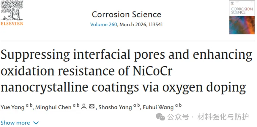 据了解,近日东北大学研究人员采用磁控溅射法制备了双层纳米晶复合涂层(MSO5)。这种复合结构有效地缓解了高温氧化过程中界面空洞的形成和氧化膜的起皱。相关研究结果以“Suppressing interfacial pores and enhancing oxidation resistance of NiCoCr nanocrystalline coatings via oxygen doping”为题被发表在期刊《Corrosion Science》上,通讯作者为东北大学陈明辉教授。