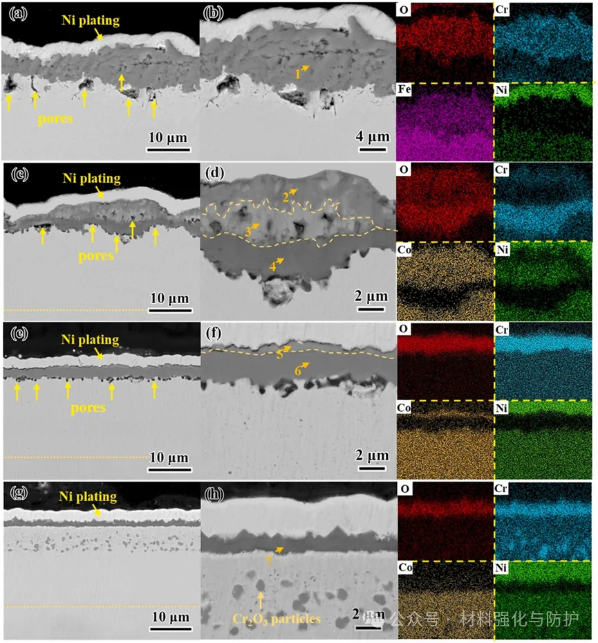 316L合金和三种涂层在800°C氧化100小时后的横截面显微结构和相应的元素分布