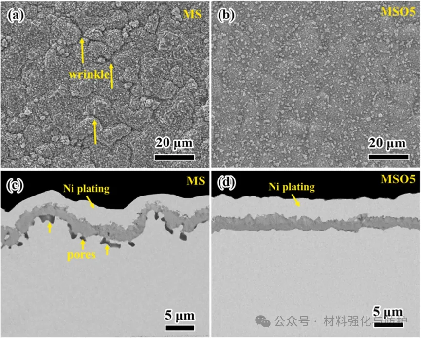 MS和MSO5涂层在900℃氧化100小时的表面和截面形貌