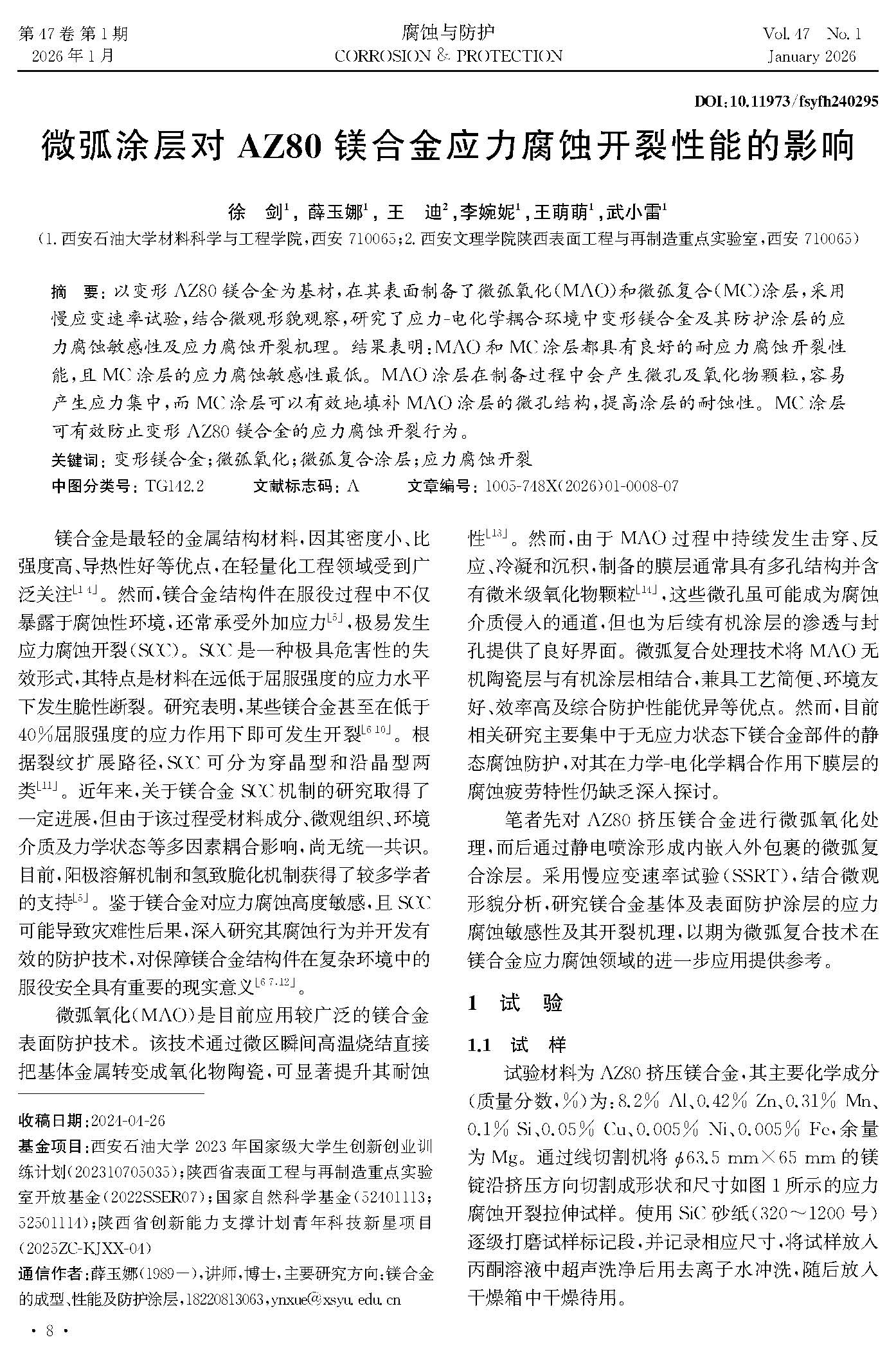 微弧涂层对AZ80镁合金应力腐蚀开裂性能的影响