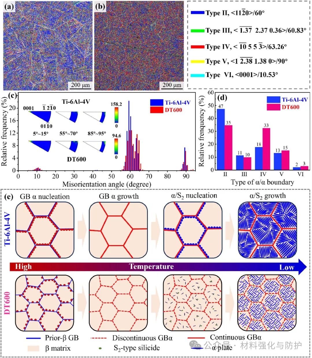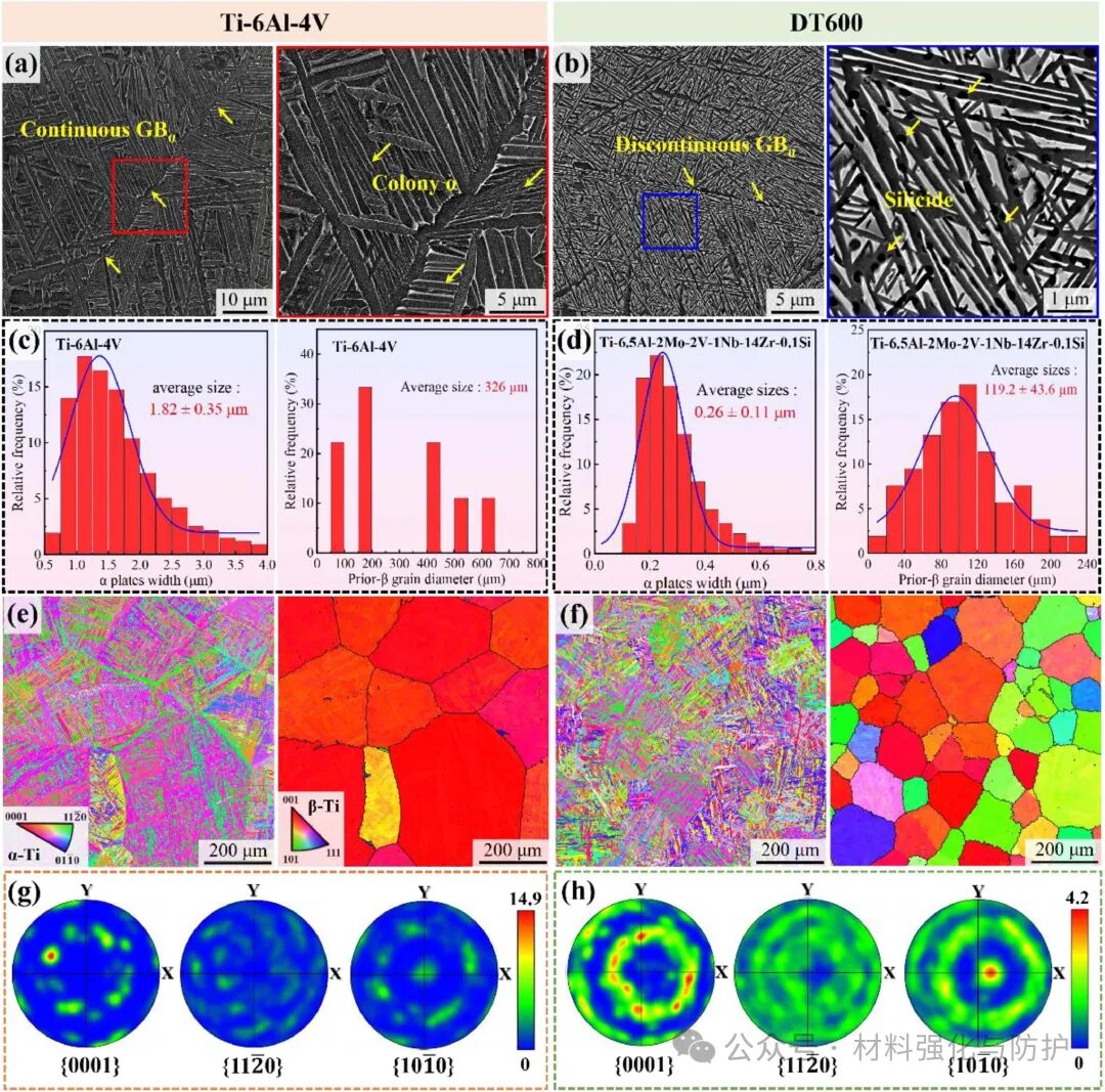 在550℃以上,DT600的α板条动态球化,形成尺寸50-100nm的亚晶,EBSD显示,550℃时低角度晶界比例增至81%,且合金在550℃变形时α板条分裂为等轴晶,硅化物抑制板条粗化,600℃时β相渗入α板条,加速球化过程。变体晶界分析表明,DT600中α变体通过自协调机制形核,因此诱发形成网篮组织和弱纹理,优化合金的高温性能。