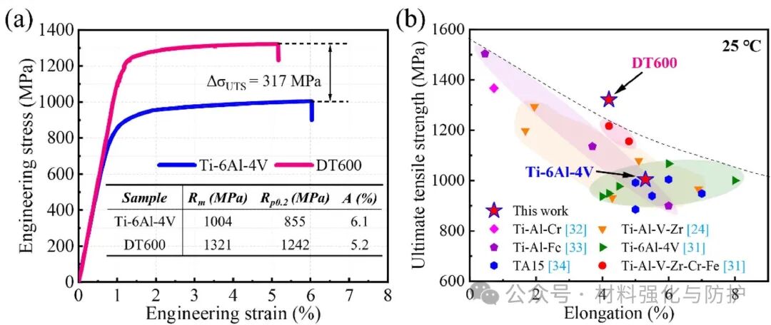 DT600在室温下具有1242MPa的屈服强度和1321MPa的抗拉强度,分别较Ti-6Al-4V提升45%和31%。在500-600℃范围内DT600的强塑协同性较目前已报道的一些常规钛合金体系具有明显优势,600℃时,DT600屈服强度(623MPa)是Ti-6Al-4V的1.7倍,同时延伸率高达46.2%。在强韧性机制方面,塑性的提升归因于动态球化机制的激活,强度提升源于固溶强化(Zr、Mo、Nb贡献268MPa)、α/β相细化(693MPa)及硅化物沉淀(59MPa),且高温下硅化物钉扎界面,有效延缓软化。