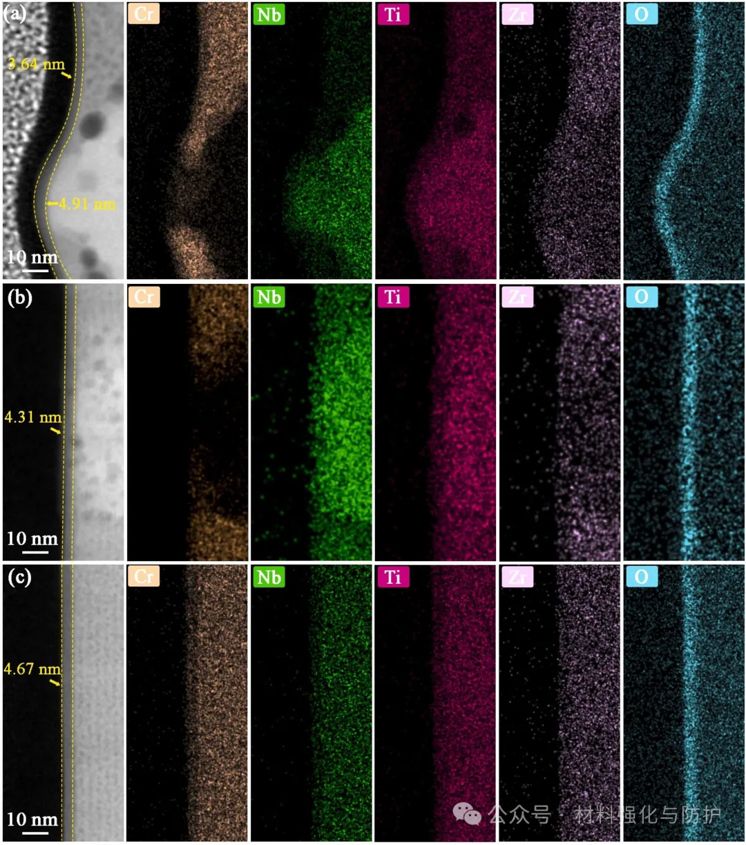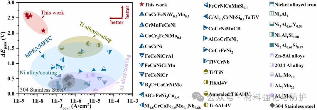 氧掺杂能够促进Zr和Ti的选择性氧化,团队通过热力学计算表明,ZrO2的形成驱动力最大,因此钝化膜呈非晶双层结构,外层形成富Ti/Zr区域作为致密的屏障层,其组成主要以TiO2和ZrO2为主,而内层则为更稳定的以Cr2O3为主的富Cr区域,与其他已报道的耐蚀金属材料或涂层体系相比,M-O2涂层Icorr比传统304不锈钢低两个数量级,ΔEpass同样超过多数高熵合金和传统涂层。