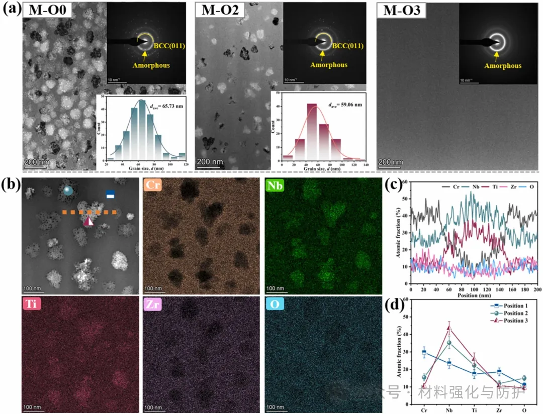 M-O0涂层中存在BCC相和ZrCr2,随着氧含量增加,涂层从BCC+ZrCr2+非晶复相结构逐渐转变为完全非晶态,M-O3涂层仅显示非晶漫散峰。同时,氧的掺入导致晶格畸变和晶粒细化,M-O2涂层中BCC相体积分数降至14.01%,平均晶粒尺寸为59.06nm,元素分布显示,(Nb, Ti)富集在晶相区,而(Cr, Zr)在非晶区分布均匀。
