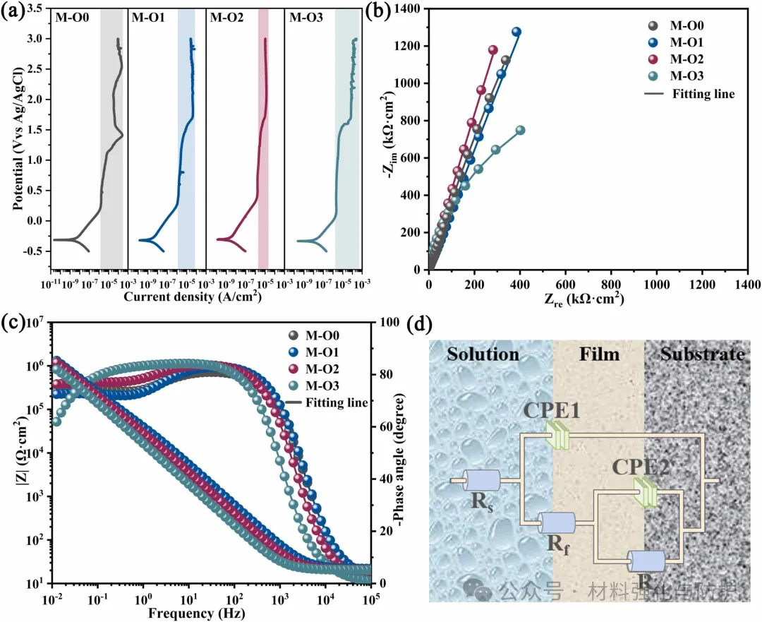 在3.5% NaCl溶液中所有涂层均呈现自钝化行为,但M-O3因氧含量过高导致钝化膜稳定性下降,相比之下M-O2涂层表现出最低的自腐蚀电流密度(Icorr=2.62×10-9 A/cm²)和最宽的钝化区(ΔEpass > 2.5V),击穿电位超过3V,并且M-O2具有最高的极化电阻(51.3MΩ·cm²),表明M-O2涂层在本研究中的几种涂层中具有最佳的耐腐蚀性。