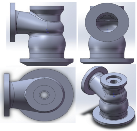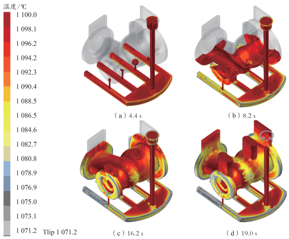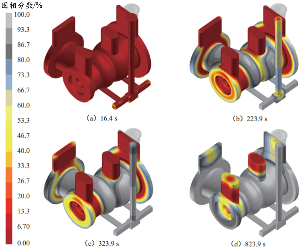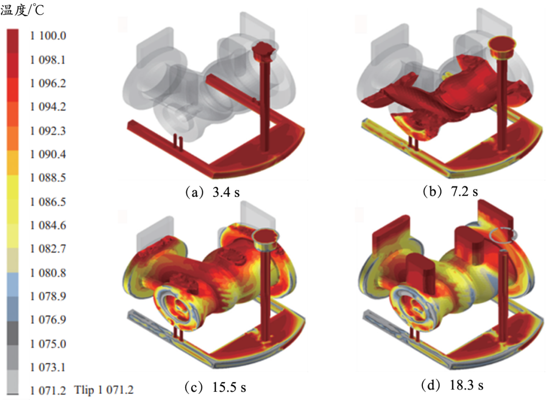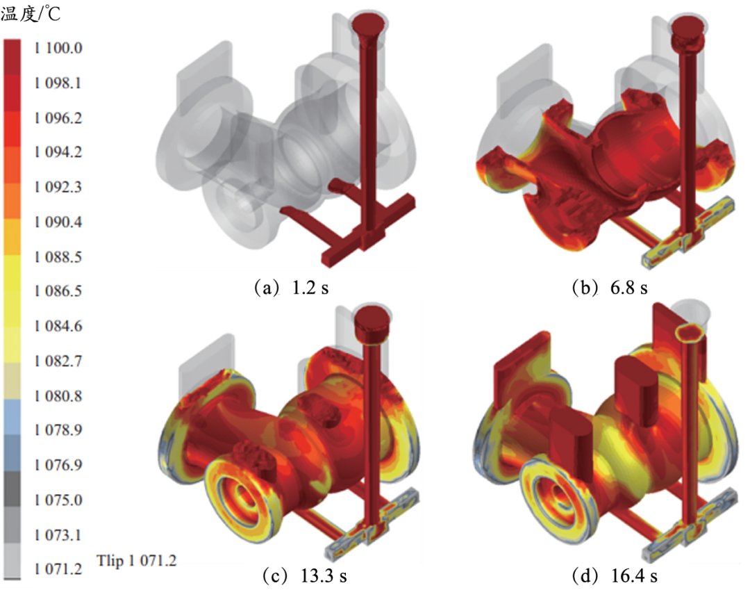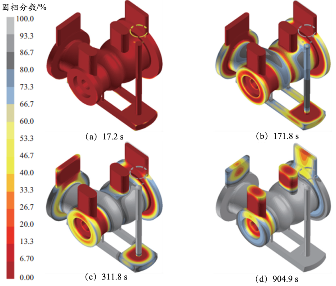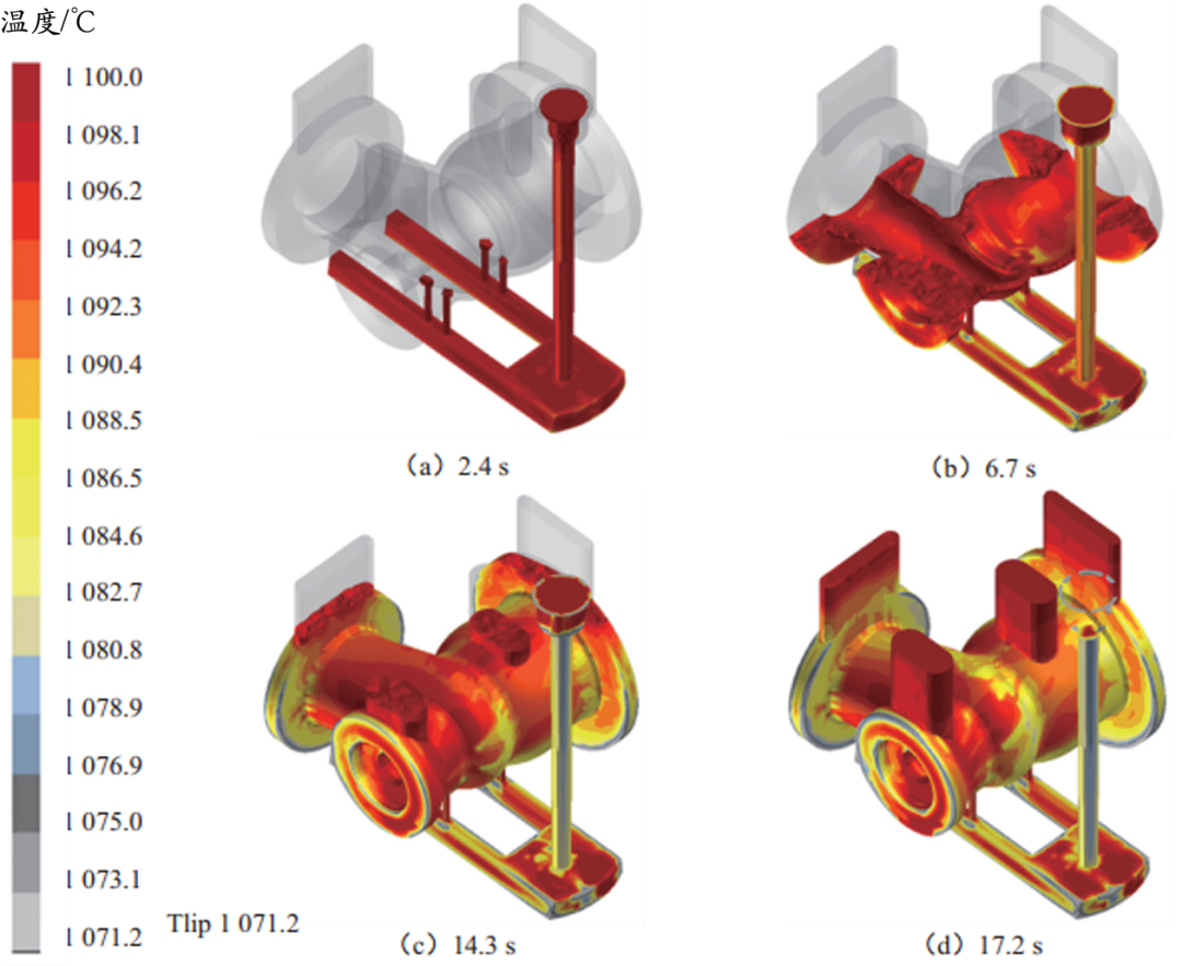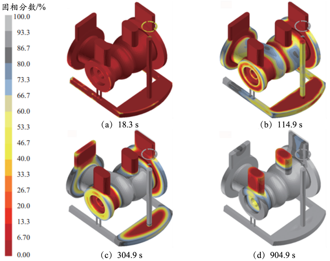 摘 要:根据新型耐高速海水冲刷腐蚀铜合金(ZCuAl7-7-4-2)的热物理性能和船用三通阀铸件的几何形状与结构特点,对三通阀铸件的铸造工艺进行了数值模拟研究。设计了底注式和底注雨淋式浇注系统,并对两种系统的浇铸质量进行分析。数值模拟结果表明,底注雨淋式浇注系统的铸造缺陷更少,且当内浇道集中分布在铸件中部薄璧区时可进一步改善铸造质量。采用正交试验对适配浇注系统的浇注工艺参数(浇注温度、浇注速度、砂型预热温度)组合进行了优化。最终确定的新型耐冲刷铜合金三通阀的铸造方案为:采用将内浇道集中在中部薄壁区的底注雨淋式浇注系统进行浇注浇注温度为1 100 ℃,浇注速度为4.5 kg/s,砂型预热温度为150 ℃。 关键词:耐冲刷铜合金; 数值模拟; 铸造; 三通阀 文中主要图表 (序号为文中序号) 图1 三通阀三维模型 图2 ZCuAl7-7-4-2 合金的热物理 性能 图3 浇注系统设计 图4 底注式浇注系统充型过程 金属液的温度场 图5 底注式浇注系统铸件的凝固 图6 底注式浇注系统铸件的缩松和 缩孔预测 图7 底注雨淋式浇注系统充型过程 金属液的温度场 图8 底注雨淋式浇注系统铸件的凝固 图9 底注雨淋式浇注系统铸件的 缩松和缩孔预测 图10 优化的浇注系统 图11 内浇道分布在中部薄壁区的 底注雨淋式浇注系统充型过程的 温度场 图12 内浇道分布在中部薄壁区的 底注雨淋式浇注系统的凝固 图13 内浇道分布在中部薄壁区的 底注雨淋式浇注系统的缩松和 缩孔预测 图14 内浇道分布在顶部厚壁区和 底部法兰区的底注雨淋式浇注系统 充型过程的温度场 图15 内浇道分布在顶部厚壁区和 底部法兰区的底注雨淋式浇注系统 的凝固 图16 内浇道分布在顶部厚壁区和 底部法兰区的底注雨淋式浇注系统 的缩松和缩孔预测 表2 正交试验的试验因素和水平设计 表3 正交试验方案及结果 表4 正交试验结果分析 结语 (1)根据三通阀铸件的几何形状和结构特点,设计了底注式和底注雨淋式2种浇注系统,结果表明,采用底注雨淋式浇注系统制备的铸件的质量更好。调整底注雨淋式内浇注系统的浇道分布后,发现将内浇道集中在中部薄壁区的浇注系统,金属液的温度分布更有利于不同区域的有序凝固,从而减少了铸件缺陷,提高了铸造质量。 (2)结合数值模拟和正交试验,发现浇注温度、浇注速度、砂型预热温度等3种浇注参数对铸件缩松和缩孔发生率的影响依次减小,最佳的浇注参数组合为:浇注温度为1 100 ℃,浇注速度为4.5 kg/s,砂型预热温度为150 ℃。