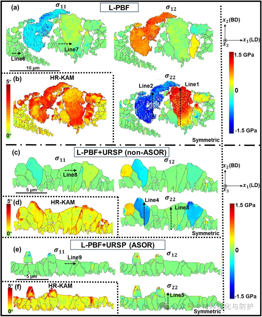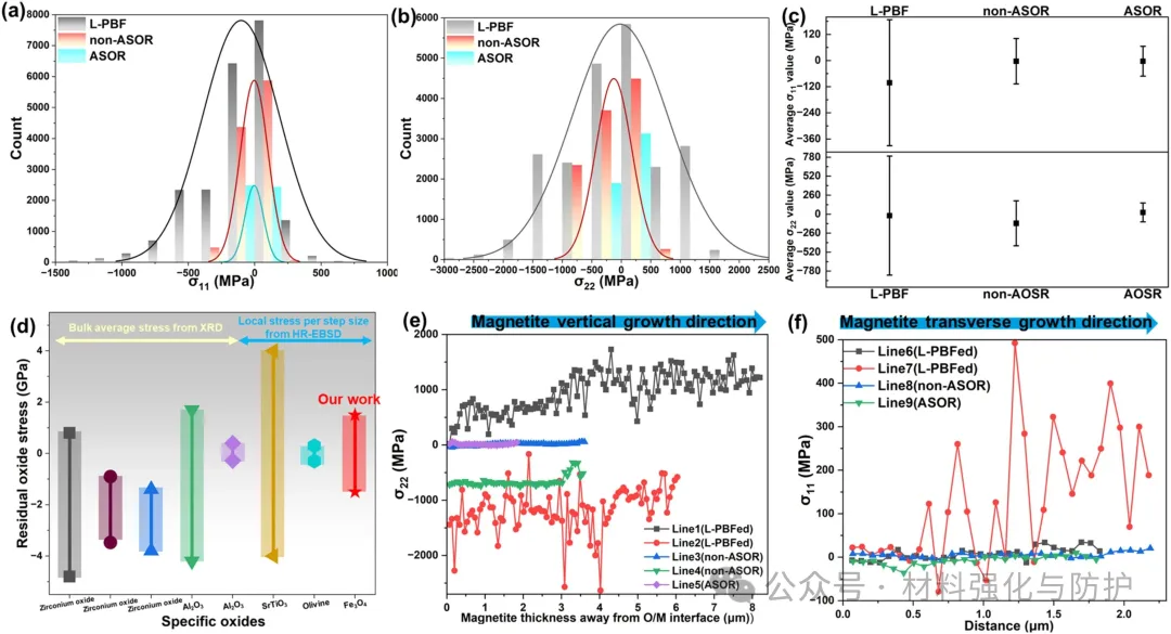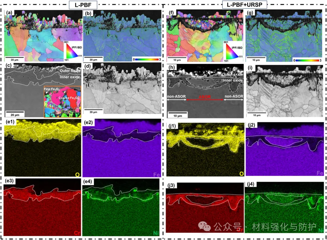 USRP处理后在钢材的表面形成了跨尺度的梯度结构,包括顶部平均粒径149.5nm,深度320nm的纳米晶层和下部微米尺寸的晶层,而未经处理的L-PBF样品表面粗糙且存在微裂纹,USRP处理的样品在高温蒸汽环境中氧化后表现出不均匀的氧化行为,形成弧形选择性氧化区(ASOR)和非ASOR区(non-ASOR)。