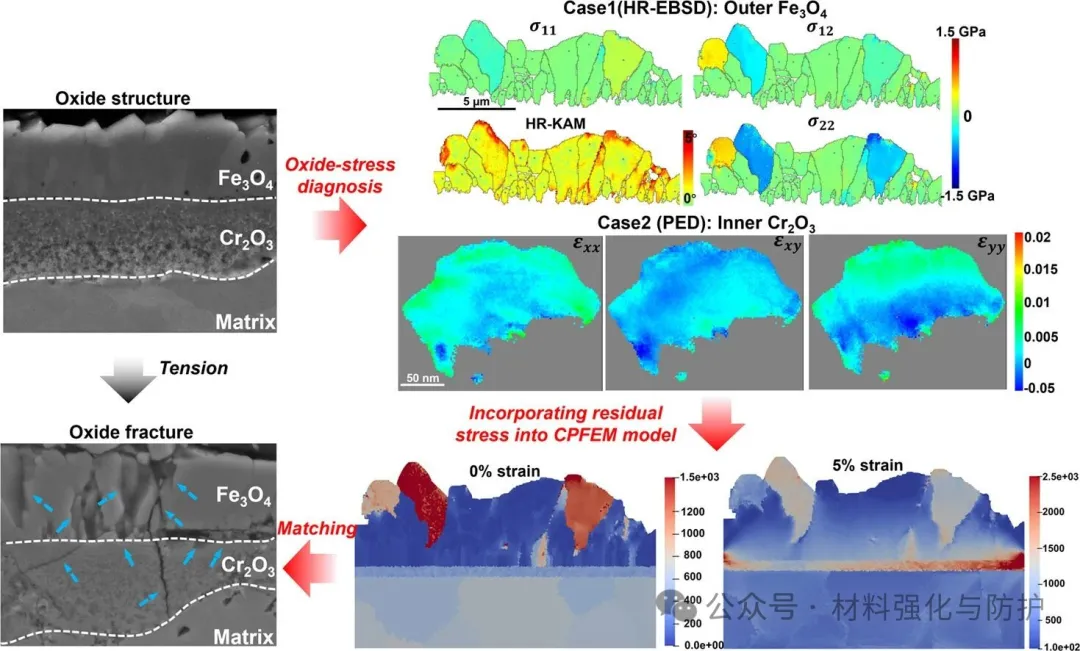 金属部件在高温环境下服役时,表面会与氧气反应形成氧化物层,虽能隔离氧进一步侵入,但氧化物通常为陶瓷材料,易发生机械断裂。一旦氧化物破裂,氧气将重新接触金属,导致氧化动力学急剧加速。尤其对于304/316奥氏体不锈钢,在超过400℃的蒸汽环境中,氧化物易发生应力腐蚀开裂(SCC),影响长期服役性能。传统研究多关注氧化行为的宏观应力,但氧化物内部晶体尺度的应力分布及其对裂纹的影响尚不明确。