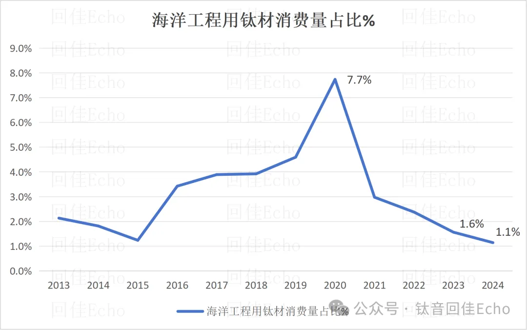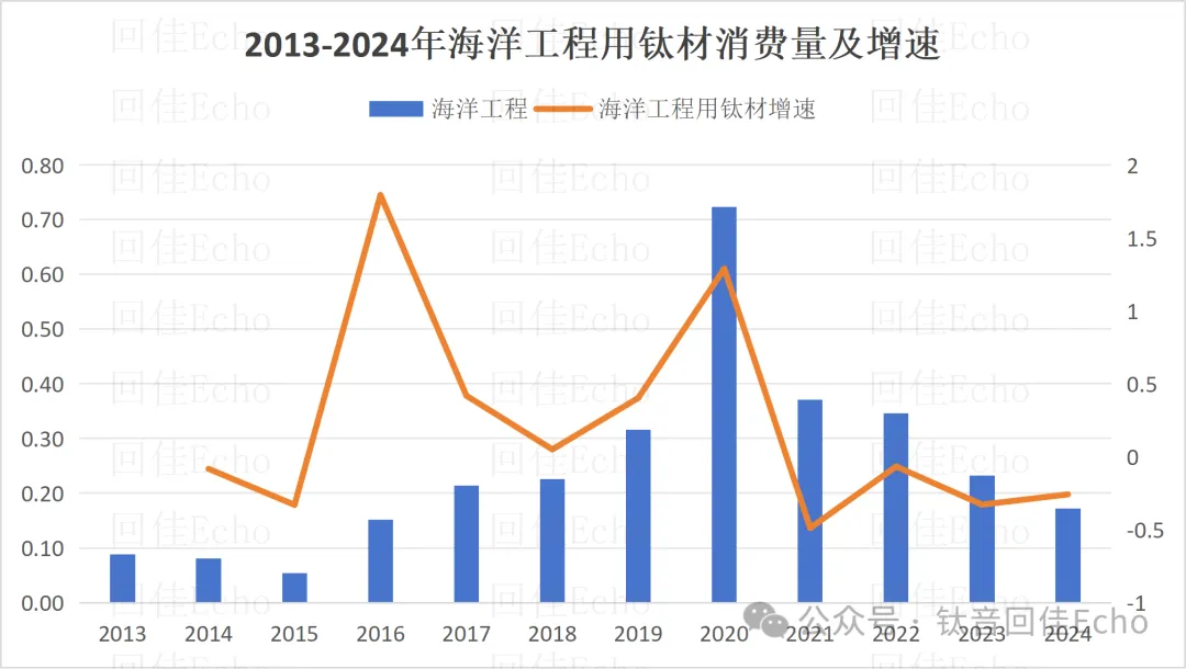 船舶用钛注重海水腐蚀环境下的经济性平衡。2024年我国钛材消费量15.09万吨,其中船舶用钛材消费量4933吨,占3.27%。从2013年的0.85%应用占比,增加到2024年的3.27%。整体来看,船舶用钛材消费量占比呈现增长趋势。