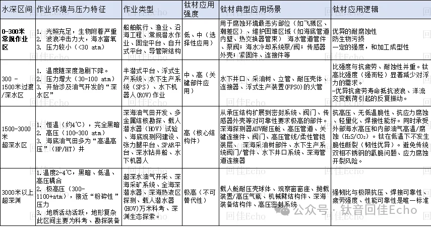 本文按深海科技知识普及、上游深海材料、钛在深海科技的应用顺序构建框架,钛在深海科技应用部分,从舰船开始,逐步深入到神秘的深海,从舰船(水面/常规深度环境)→ 海洋工程(固定平台设施/全水深环境)→ 深海科技(高压+极端环境)的浅海到深海、常压到高压的方向顺序分类。浅海与水面由舰船主导,钛用于解决腐蚀和生物附着;中深海由海洋工程主导,钛用于解决强度和浮力矛盾;极端高压环境的深海,由深海科技主导,钛用于对抗极致压力。