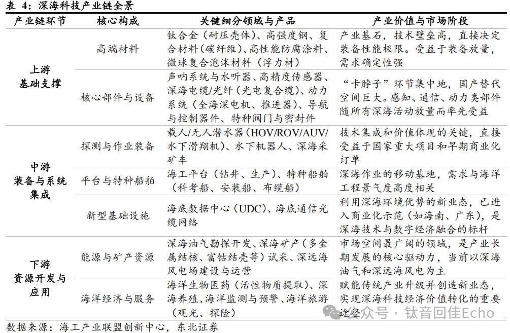 深海科技产业链分为上游基础材料与核心部件、中游装备制造与系统集成、下游资源开发与服务三大环节,形成从基础材料到终端应用的体系。