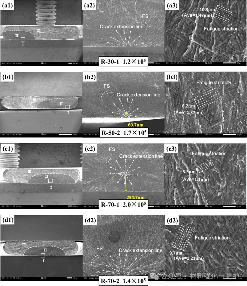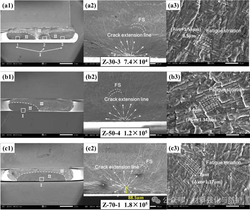 随LSP重叠率升高,疲劳裂纹形核位点数量减少且向亚表面迁移,疲劳辉纹宽度变窄,裂纹扩展速率降低。相同重叠率下,旋转扫描试样均为单一形核位点,之字形扫描存在多形核位点,证实均匀性是影响裂纹萌生源的关键因素。