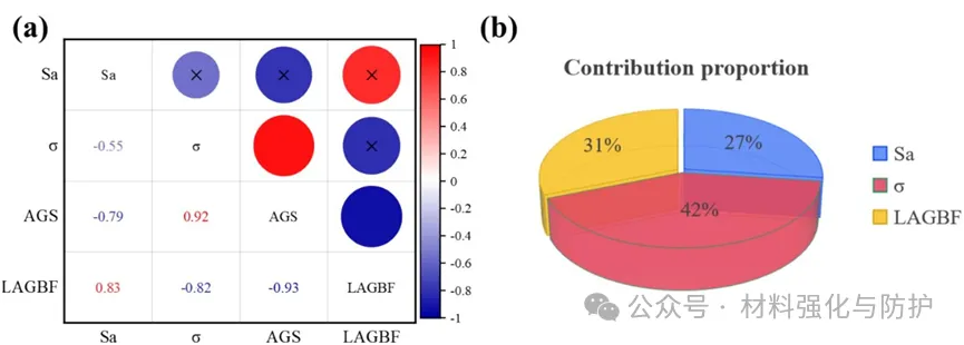 基于皮尔逊相关系数筛选出表面粗糙度(Sa)、表面残余应力(σ)、低角度晶界占比(LAGBF)三个独立核心指标,通过随机森林分析确定三者对疲劳寿命的贡献度为27%、42%和31%,并作为权重建立加权均匀性系数(E)评价模型,实现对LSP后表面完整性均匀性的综合定量表征,解决了传统单维度评价的局限性。