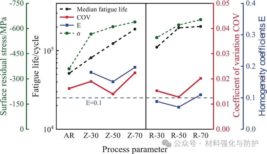 表面完整性振幅、均匀系数与疲劳性能之间的关系示意图