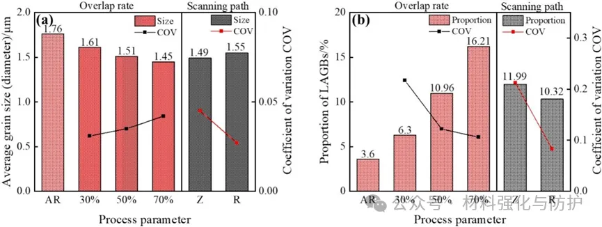不同处理方式下样本的平均粒度(a)和LAGBs比例(b)的平均振幅和系数变化