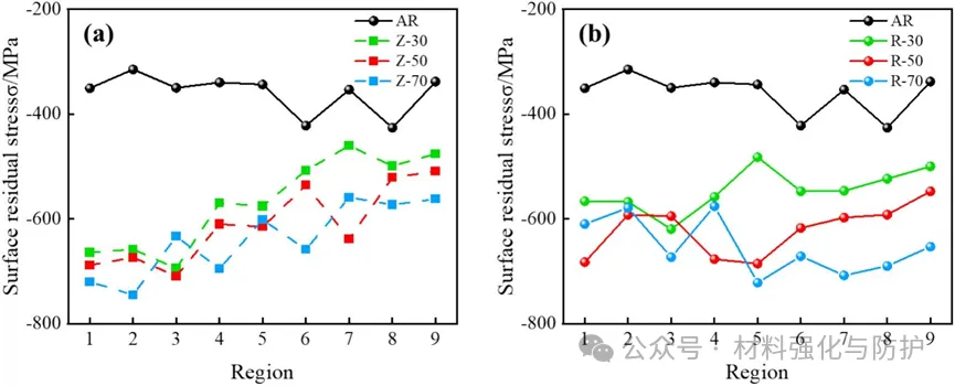 对照(AR)试样以及采用LSP处理处理的试样,采用(a)之字形扫描路径和(b)旋转扫描路径处理样品的表面残余应力测量