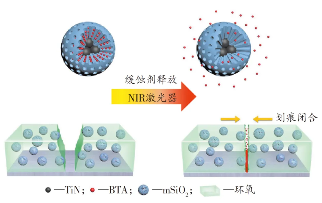 作者简介 吴杨敏,博士,中国科学院宁波材料技术与工程研究所海洋关键材料重点实验室助理研究员,主要从事深海极端环境材料表界面调控及防护机制的研究工作。宁波市拔尖人才,承担国家自然科学基金青年基金等项目,以第一作者在Advanced Materials等高水平期刊发表论文10篇,申请国家发明专利8项,授权5项,长期担任Carbon等主流期刊的审稿人。 海洋环境智能防腐涂层:结构设计与响应机制 Intelligent Anti-corrosion Coating for Marine Environments:Structural Design and Response Mechanism 孙迎翔1,2,柯燕飞2,吴杨敏*2,赵长春*3,赵文杰2 (1. 宁波大学材料科学与化学工程学院,宁波315211;2. 中国科学院宁波材料技术与工程研究所海洋关键材料重点实验室,宁波315201;3. 北京航空航天大学宁波创新研究院,宁波315800) 摘要: 为满足海洋环境下的长周期腐蚀防护的需求,当前研究重点主要集中在高性能智能响应腐蚀防护涂层,以及设计和开发出具有早期损伤预警与自修复功能的复合涂层。系统概述了国内外海洋苛刻环境下智能防腐涂层材料的最新研究进展,主要包括自修复防腐涂层和自预警防腐涂层,并介绍了关键因素对腐蚀防护性能的影响。未来,水下自修复、多通道缺陷响应、原位海洋验证实验和工业化应用是发展高性能海洋环境智能防腐涂层的重要趋势。 关键词: 海洋环境;腐蚀防护;自修复;自预警;智能响应 本文作为参考文献标准著录格式: 孙迎翔,柯燕飞,吴杨敏,等. 海洋环境智能防腐涂层:结构设计与响应机制[J]. 涂料工业,2024,54(9):77-84. SUN Y X,KE Y F,WU Y M,et al. Intelligent anti-corrosion coating for marine environments:structural design and response mechanism[J]. Paint &Coatings Industry,2024,54(9):77-84. 国家自然科学基金(52301406,52205236);中国博士后科学基金面上资助(2023M733600);宁波市自然科学基金(2023J329) 吴杨敏(1992—),男,博士,助理研究员,主要研究方向为二维片层材料增强聚合物涂层在海洋环境下的腐蚀与防护。 赵长春(1990—),男,博士,副研究员,主要研究方向为金属基复合材料强韧化及耐磨防腐机制研究和过渡族金属碳氮化物表面润湿性调控研究。 早在2017年,中国工程院侯保荣院士就指出,我国每年因腐蚀造成的经济损失高达2. 1万亿元人民币,约占当年国民生产总值的3.34%。因此,针对苛刻海洋环境中的关键和共性腐蚀问题,发展高性能长寿命腐蚀防护技术,减少因腐蚀而引起的安全和经济损失等问题,提升海工装备等金属构件的运行稳定性和可靠性,具有重要的意义。 当前,海洋环境中腐蚀防护策略主要包括电化学保护、缓蚀剂保护和有机涂层保护等。涂覆有机涂层因其简单的操作、良好的稳定性和优异的力学性能等优势,是当前应用最广泛的一种防腐方法。传统有机涂层在涂覆、成膜、固化和服役过程中不可避免地会产生微缺陷,从而导致涂层快速失效。尤其是在海洋环境中,随着服役时间的延长,损伤区域会急剧向外扩展,引发严重的界面腐蚀乃至涂层剥离失效。因此,在发生损伤时立即精准地定位缺陷和腐蚀区域,同时对损伤区域进行高效及时的修复,从而降低生产、维护成本,开发环境智能响应型防腐涂层,大幅度延长海工设施等金属装备在海洋环境中的长效稳定服役具有重要意义。 因此,本文在介绍环境智能响应型防腐涂层概念的基础上,分类总结了国内外海洋苛刻环境下自修复、自预警等涂层的最新研究进展,讨论了关键因素对其腐蚀防护性能的影响,最后阐述了目前环境智能响应型防腐涂层面临的机遇和挑战,并展望了其发展方向与趋势。 1 智能响应涂层 当前,智能响应型防腐涂层根据功能可分为:自修复防腐涂层和自预警防腐涂层。 1.1 自修复涂层 1.1.1 外援型自修复防腐涂层 外援型自修复防腐涂层主要是指在聚合物基质中引入功能性填料来赋予涂层一定的自修复性能。这些功能性填料主要包括缓蚀剂、修复剂等,通常负载在填料表面或者容器内部,并通过外界刺激响应释放,发生修复行为。早在2001年,White等首次将含有修复剂的微胶囊引入到涂层内部,当涂层发生损伤时,微胶囊囊壁破裂会释放出内部的修复剂,实现涂层的自修复,修复效率最高可达75%,从而延长涂层的服役周期。此后,自修复防腐涂层领域的报道日渐增多。 苯并三氮唑(BTA)是一类非常经典的缓蚀剂,广泛应用于金属的腐蚀防护领域。Liu等将环糊精(CD)引入到还原氧化石墨烯(rGO)表面制备了石墨烯基纳米容器(rGO-CD),并将BTA缓蚀剂负载在容器内部(rGO-CD-BTA)以赋予环氧涂层优异的自修复能力。相比于pH=4和7的服役环境,rGO-CDBTA在pH=10时拥有最大的曲线斜率(0.278),表明复合涂层具有优异的基于pH刺激响应性;微区电化学(LEIS)测试结果表明,由于BTA的刺激响应释放,复合涂层(rGO-CD-BTA/EP)划痕附近的电化学反应会受到很大的抑制,腐蚀面积和反应程度随时间的延长不断减少,说明其具有优异的刺激响应自修复性能。Ouyang等对介孔二氧化硅(MSN)表面进行硅烷改性,负载2-巯基苯并噻唑(MBT),并结合层状双金属氢氧化物(LDH),得到基于pH 响应释放的MSN-MBT@LDHs 纳米填料。结果表明,MSNMBT@LDHs 在酸性条件下(pH=2),MBT 会大量释放,从而修复涂层缺陷。 北京科技大学张达威教授团队基于氮化钛(TiN)纳米颗粒的光热响应特性制备了一种具有双重作用的自修复防腐涂层。他们设计了一种TiN@介孔二氧化硅(mSiO2)核壳纳米容器,负载BTA分子(TiN-BTA@mSiO2),并添加到可自修