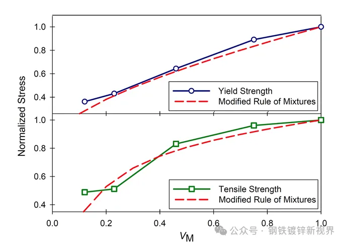 图6 使用归一化屈服应力和抗拉应力表示的修正混合定律,预测DP钢强度作为VM的函数