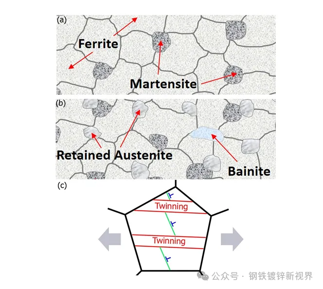 图3 a DP钢、b TRIP钢和 c TWIP钢的示意性显微组织