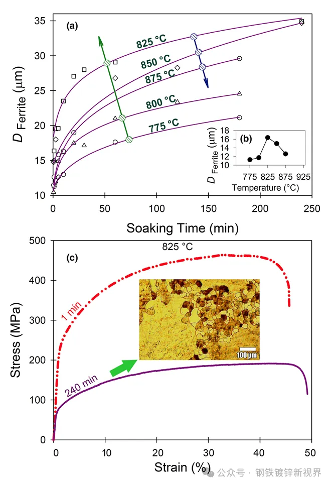 图9 St12 DP钢的晶粒长大:a 退火温度和保温时间对铁素体晶粒尺寸的影响,b 保温1分钟时温度对铁素体晶粒尺寸的影响,以及 c 异常晶粒长大对DP钢工程应力-应变曲线的有害影响