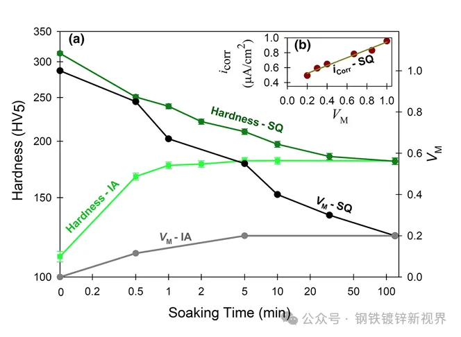 在临界区退火过程中,VM高度依赖于保温时间,特别是在SQ路线的情况下。图8a显示,对于SQ路线,在临界区退火温度下保温期间,马氏体数量减少。相反,对于IA路线,马氏体量迅速增加并达到一个恒定值。之后,铁素体的体积分数不再随时间改变。这些变化无疑对DP钢的硬度和力学性能有直接影响,如图8a所示。此外,增加VM对DP钢的耐腐蚀性有恶化影响,如图8b所示。这种行为在其他研究工作中也有报道。有研究指出,任何常见DP钢中的马氏体相本质上都呈现板条类型,尽管也观察到一些微孪晶。对于马氏体对DP钢电化学腐蚀行为有害影响的两个主要原因已被提出,即:(I)马氏体形成产生的残余应力,以及(II)由于以非常细的针状或层状结构排列的马氏体和铁素体相之间的互连导致的大面积微电偶腐蚀电池的形成。