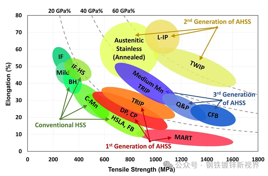 图2 各种AHSS钢级的抗拉强度与总延伸率关系图(图中标注:20 GPa%, 4, 80, 70)