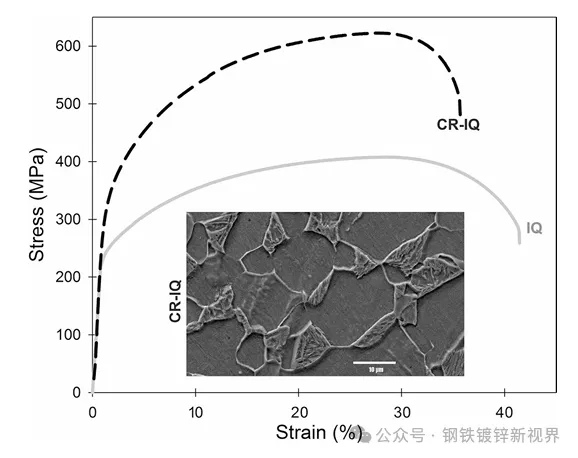 图11 a 在CR-IQ样品的DP结构中形成链网状马氏体岛,以及 b 相应的工程应力-应变曲线