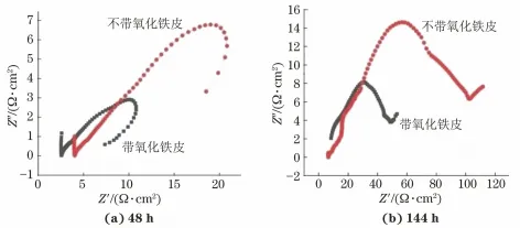 图8 经过不同时间盐雾腐蚀试验后有无氧化铁皮试样在3.5%NaCl溶液中的Nyquist图