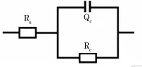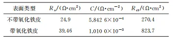 由图6可见:带氧化铁皮试样的半圆半径远大于无氧化铁皮试样。由于此时试样尚未进行盐雾腐蚀试验,因此没有锈层,可将氧化铁皮视为电阻和电容并联。采用图7所示等效电路拟合电化学阻抗谱,其中Rs为溶液电阻,C电容,Rct是界面转移电阻,拟合结果见表2。由于氧化铁皮中含有孔隙和裂纹等缺陷,其电阻虽然比无氧化铁皮试样更大,但还未达到绝缘的程度。