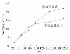 图2 有无氧化铁皮试样经过盐雾试验后的腐蚀质量增加曲线