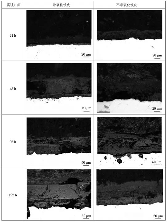 由图2可见:在腐蚀72h内,不带氧化铁皮试样单位面积腐蚀质量增量略高于带氧化铁皮试样,说明氧化铁皮起到了物理屏障的作用,阻挡了腐蚀液向内扩散。当腐蚀时间为96h时,带氧化铁皮试样的腐蚀质量增量反超无氧化铁皮试样。
