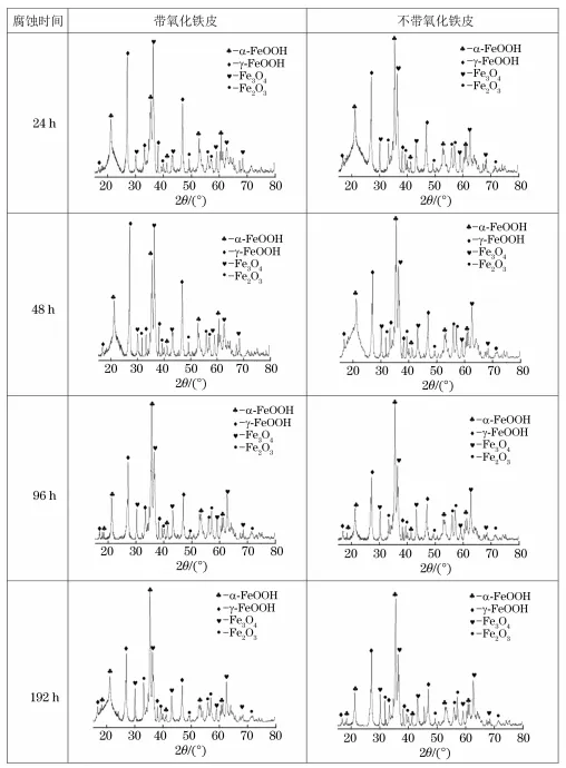 由图3可见:当腐蚀时间为24h时,带氧化铁皮试样表面只产生一层结构松散的外锈层,厚度约为25μm。无氧化铁皮试样表面锈层厚度约为30μm,也是结构松散的。延长腐蚀时间至48h,腐蚀液已经穿过氧化铁皮层腐蚀基体。在形成内锈层的同时,外锈层的厚度也明显提高。对于无氧化铁皮试样,表面锈层继续变厚,但结构依然松散,腐蚀96h后带氧化铁皮试样表面锈层整体厚度增加,外锈层开始变得致密。腐蚀192h,外锈层的厚度没有太大变化,但已经变得非常致密。内锈层厚度持续增加,同时内锈层也开始向致密化转变。