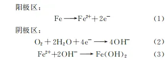快速腐蚀阶段:随着外锈层达到一定厚度, 由于腐蚀时间延长,逐渐长大的腐蚀性产物在氧化铁皮的缺陷处促进裂纹产生。腐蚀液沿裂纹进入内部腐蚀基体,使基体处迅速形成内锈层腐蚀核,形成了以氧化铁皮为阴极,内锈层腐蚀核为阳极的腐蚀电池,电极反应见式(1) ~ (3)。