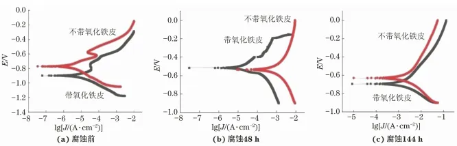 图5 经过不同时间盐雾腐蚀的有无氧化铁皮试样在3.5%NaCl溶液中的极化曲线