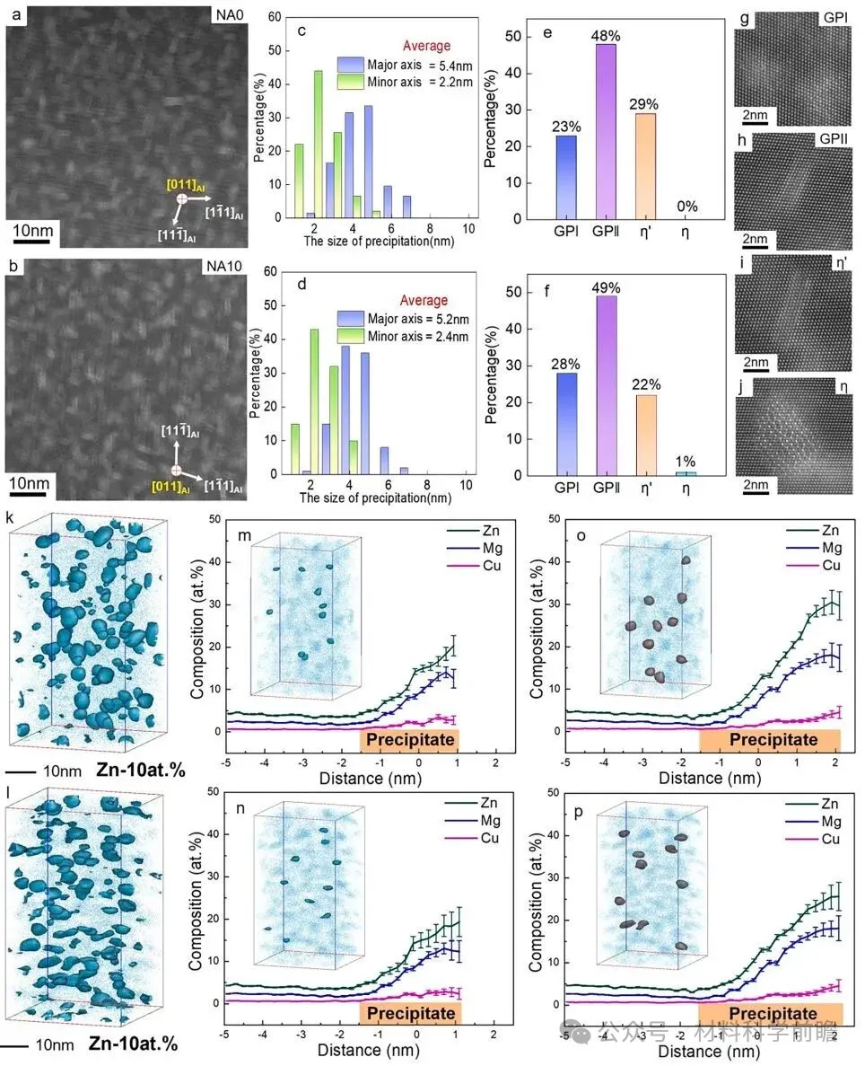 晶内析出特征改变提高抗拉强度:两种样品的晶内都形成了棒状和近球形析出物(图3(a, b)),相比NA0样品,NA10样品析出物的平均长轴长度减小,平均短轴长度增加,从而形成更像球形的形貌和更均匀的尺寸分布(图(3(c-j)));在析出类型方面,NA10样品GPI区的比例增加,而η’比例减少;3D-APT结果表明,NA10样品具有更高的析出密度(1.75×1024 m-3 vs 1.52×1024 m-3),同时GPI和η’中最大Zn和Mg浓度都有所降低,在总体成分相似的情况下有利于形成更高体积分数的析出物,晶内更加球状、弥散和数量更多的析出物有助于提高抗拉强度。 图3 峰时效状态下NA0和NA10样品晶内析出物分析:(a)和(b)分别为NA0和NA10样品的析出物形貌;(c)和(d)分别为NA0和NA10样品的析出物尺寸分布统计;(e)和(f)分别为NA0和NA10样品的析出物类型统计;(g-j)为不同析出物的代表性形貌;(k)和(l)分别为NA0和NA10样品的3D-APT析出物重构;(m)和(n)分别为NA0和NA10样品晶内GP区成分线扫;(o)和(p)分别为NA0和NA10样品晶内η’成分线扫。