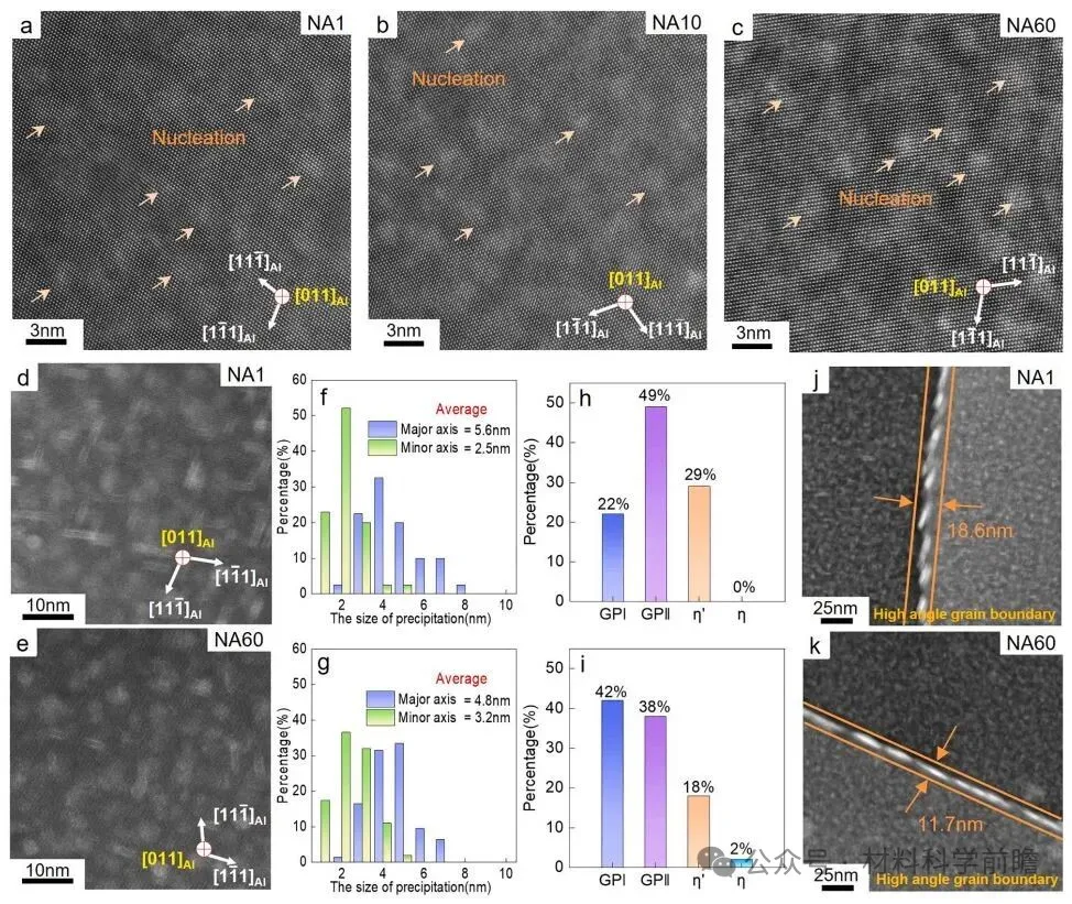 自然时效预处理时间优化 当自然时效预处理时间过短(1天,称为NA1),导致GPI区尺寸过小(图4(a, d, f, h),1.1-1.7nm),120℃人工时效过程中容易部分溶解,降低了峰时效状态下析出物的数密度并促进粗化,不利于提高合金强度。当自然时效预处理时间过长(60天,称为NA60),容易导致更稳定GPI区的形成(图4(c, e, g, i)),在后续人工时效过程中难以转变为GPII和η’相,由于GPII和η’相通常表现出更优的析出强化效果,同样不利于提高合金强度。 因此,必须选择合适的自然时效预处理时间,使得初始形成的晶内析出物大于人工时效温度下的临界形核尺寸,同时使溶质向高能晶界的扩散最小化。此外,应保持足够的相变驱动力,以确保后续形成高密度的GPII和η’析出物。 图4 不同热处理条件下析出物的形貌和统计分析。(a-c)不同自然时效预处理后的晶内析出物形貌:(a)NA1样品,(b)NA10样品,(c)NA60样品;(d, e)峰时效状态下的晶内析出物形貌:(d)NA1样品,(e)NA60样品;峰时效状态下晶内析出物尺寸统计分析:(f)NA1样品,(g)NA60样品;峰时效状态下晶内析出物类型统计分析:(h)NA1样品,(i)NA60样品;峰时效状态下晶界析出物形貌:(j)NA1样品,(k)NA60样品。 文章结论 本文在Al-Zn-Mg-Cu合金中提出了一种通过适当自然时效预处理实现的组织调控策略,通过该策略,可以使合金在其峰时效状态下形成具有更高数密度和尺寸分布更均匀的晶内析出物,从而提高抗拉强度;同时形成尺寸显著减小且Mg/Zn比增加的晶界析出物,减小晶界和晶内组织差异,从而提高应力腐蚀抗力。这些微观结构改变化导致强度和应力腐蚀抗力同时得到改善。该策略为平衡超高强度铝合金的强度和应力腐蚀抗力提供了一条新途径。