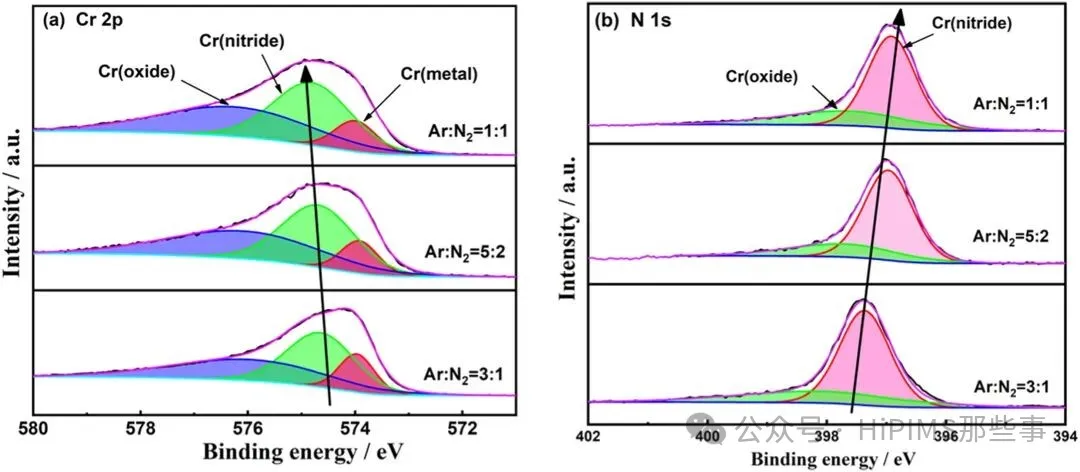 图2. 原始CrN样品的峰拟合图:(a) Cr 2p谱, (b) N 1s谱。