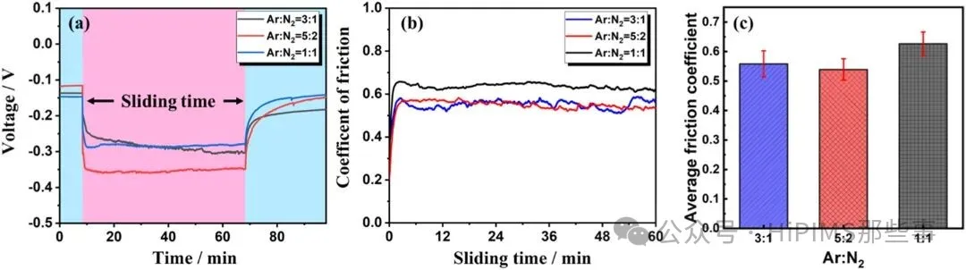 图8. 不同Ar:N₂比例的CrN涂层的(a)开路电位(OCP)、(b)摩擦系数-时间曲线和(c)摩擦系数平均值及标准偏差。