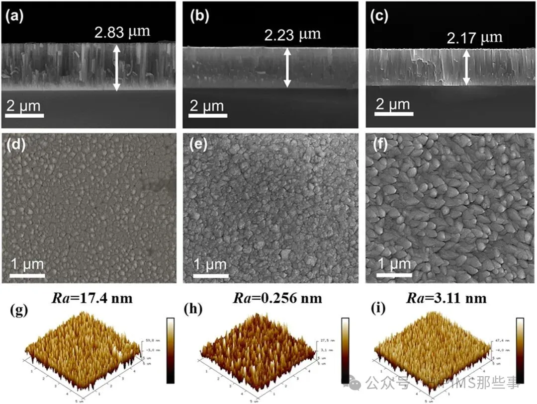 图3. 沉积薄膜的(a-c)截面、(d-f)表面形貌图像和(g-i) AFM图:(a, d, g) Ar:N₂=3:1, (b, e, h) Ar:N₂=5:2, (c, f, i) Ar:N₂=1:1。