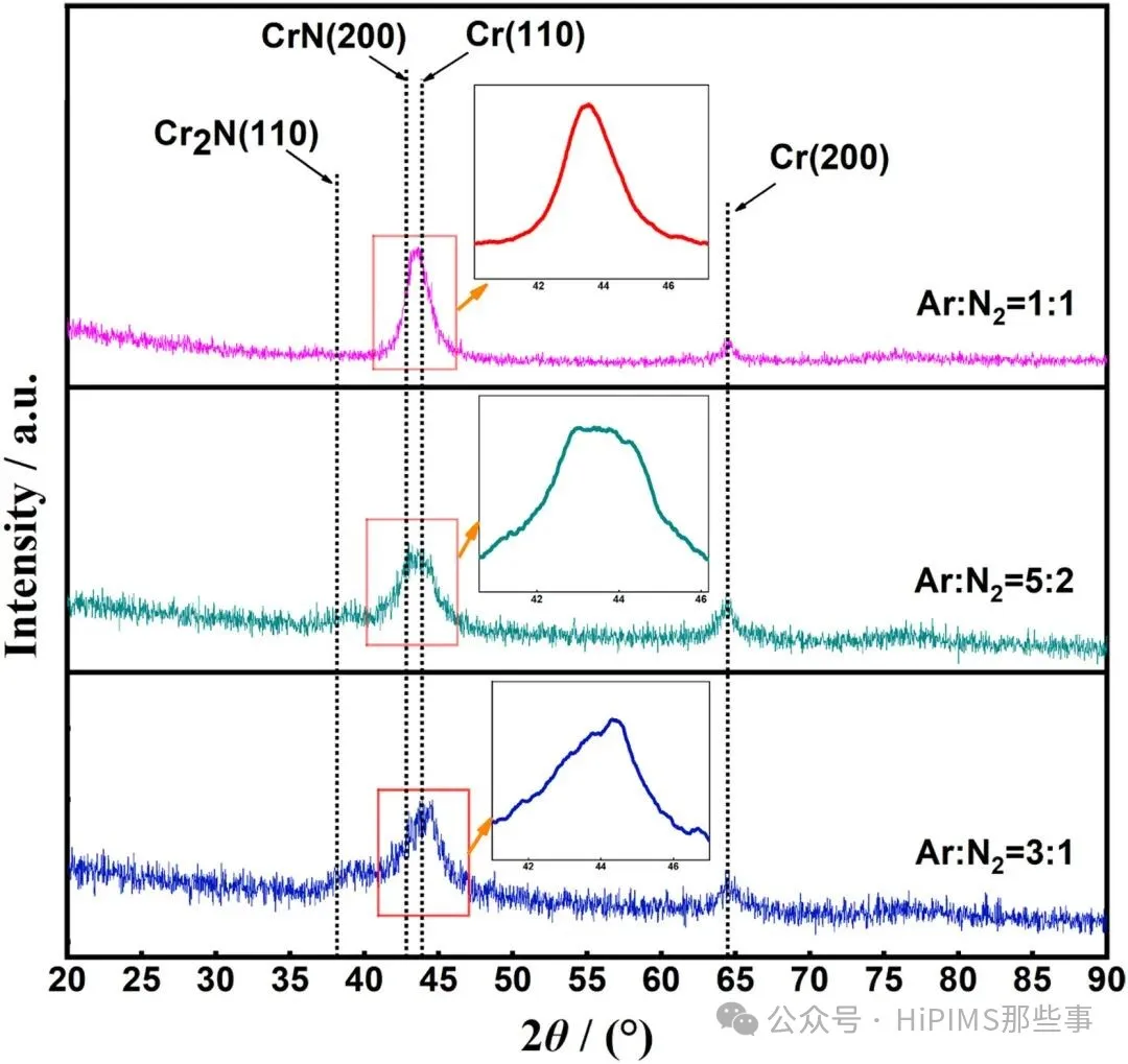 图1. 在不同Ar:N₂比例下沉积在431钢基底上的CrₓN涂层的XRD图谱。